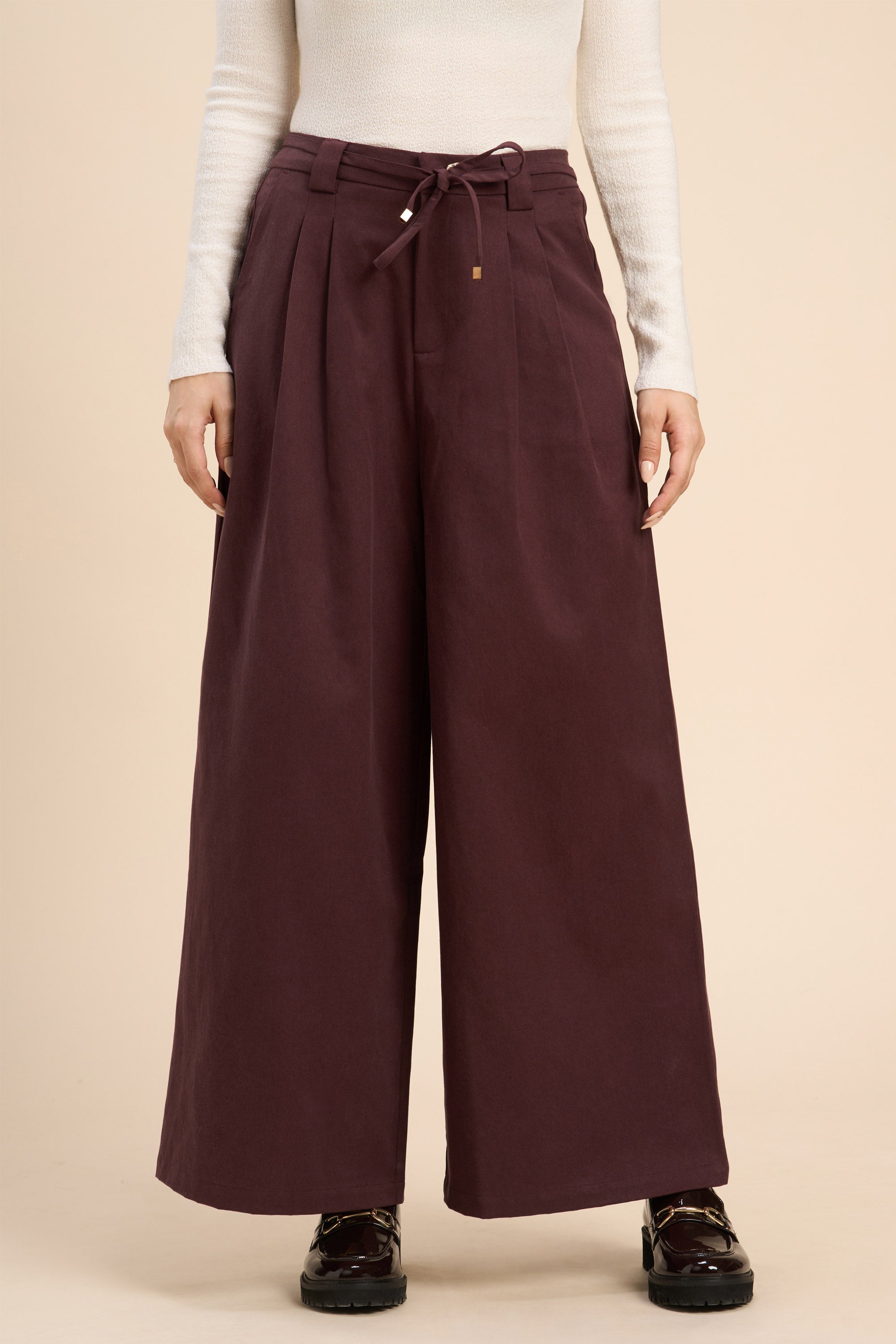 ALINA WIDE ANKLE PLEATED PANT WITH JEWEL BUTTON AND ROPE BELT