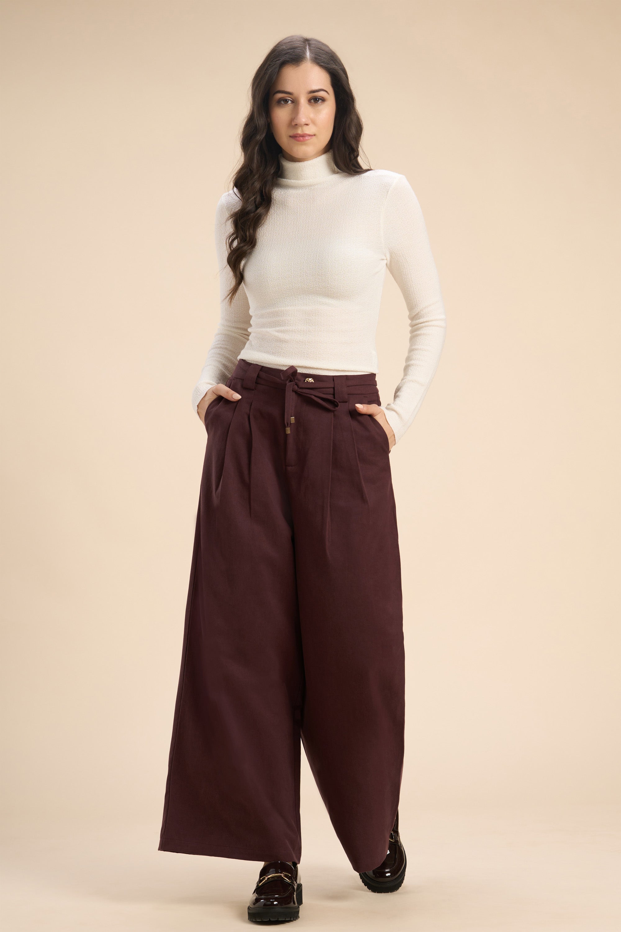 Designed to dress up or down, these wide-leg ankle-length pants, featuring sharp waist pleats, a chic rope belt with gold metal stoppers, and a statement jewel button. Perfect for workdays, brunch dates, evening plans, or smart-casual outings, they bring effortless polish to any look.
