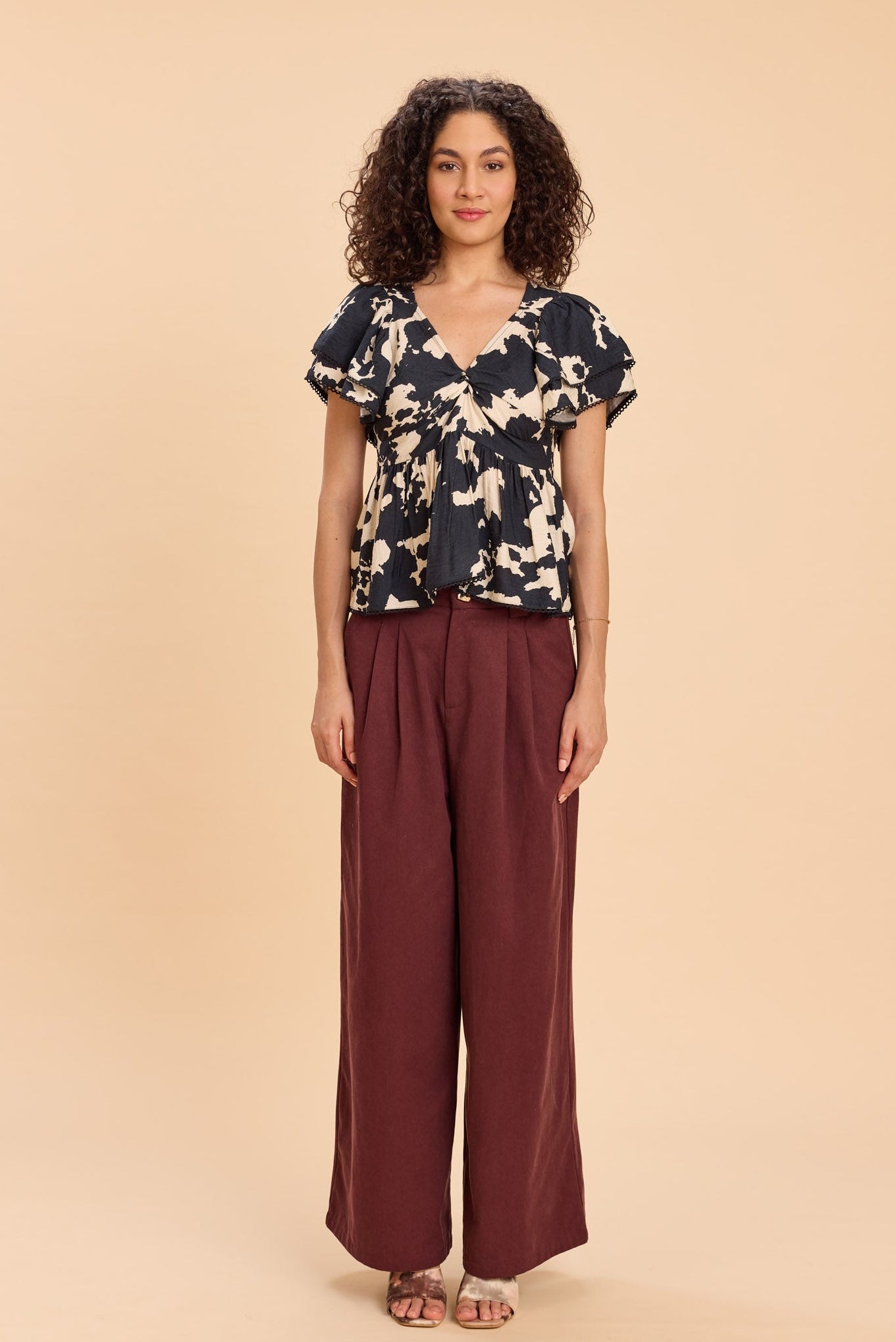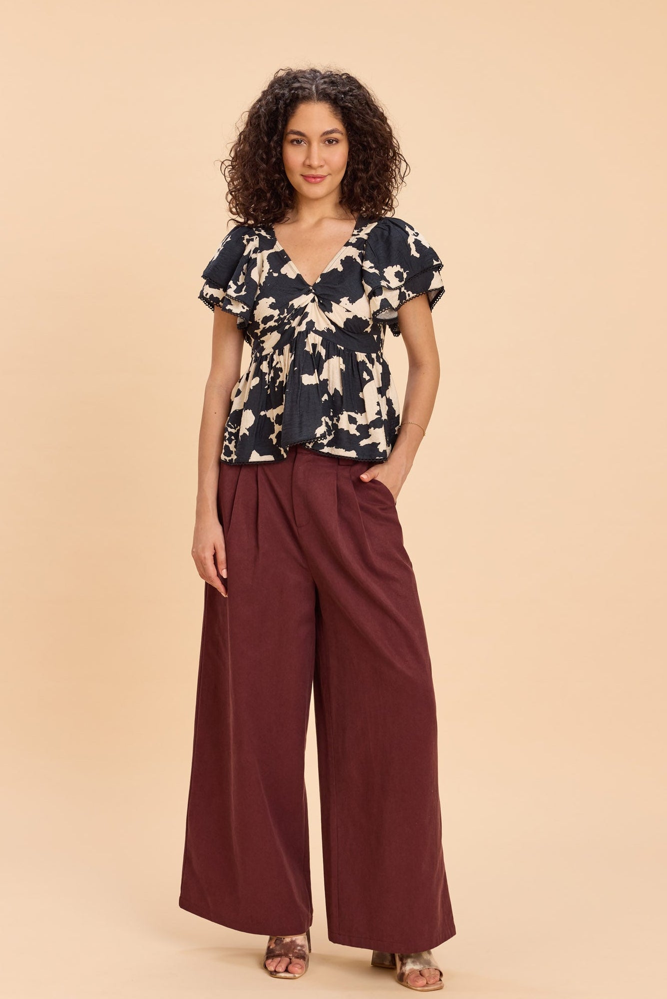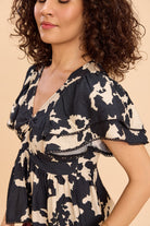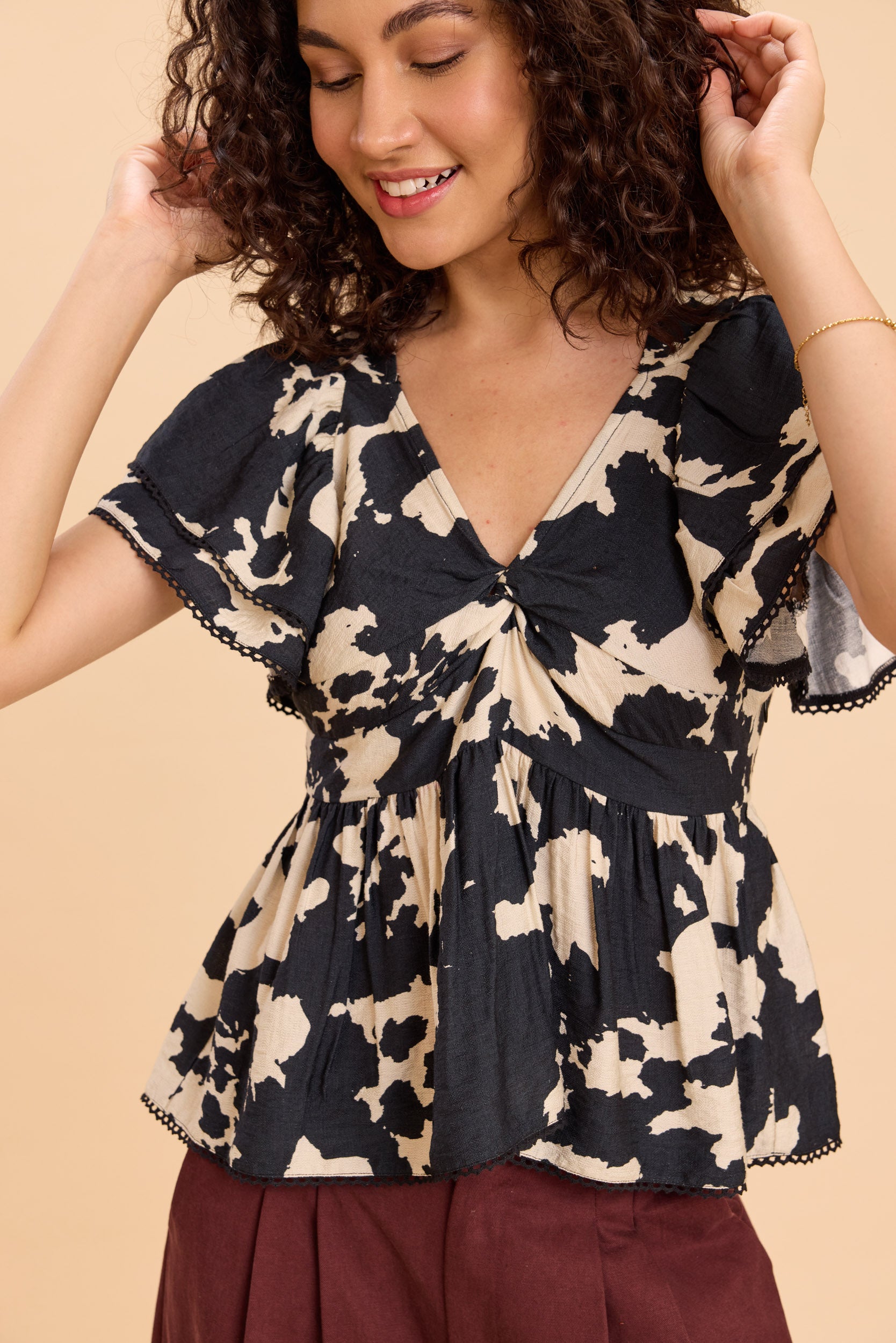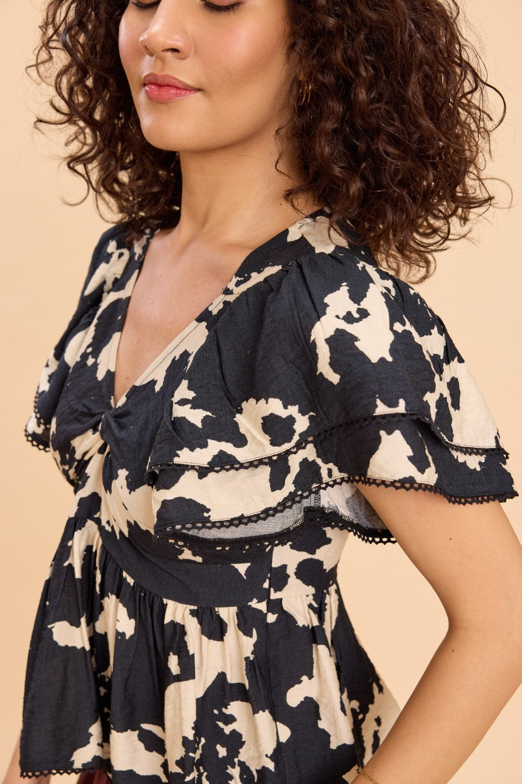 Designed to flatter, this printed peplum top features a fun black-and-white print with a twist-detail neckline, cinched waist, and playful two-tier angel sleeves finished with delicate lace edging along the sleeves and hem. Perfect for brunch dates, casual evenings, vacations, or day-to-night outings, it adds effortless drama and feminine charm to any look.