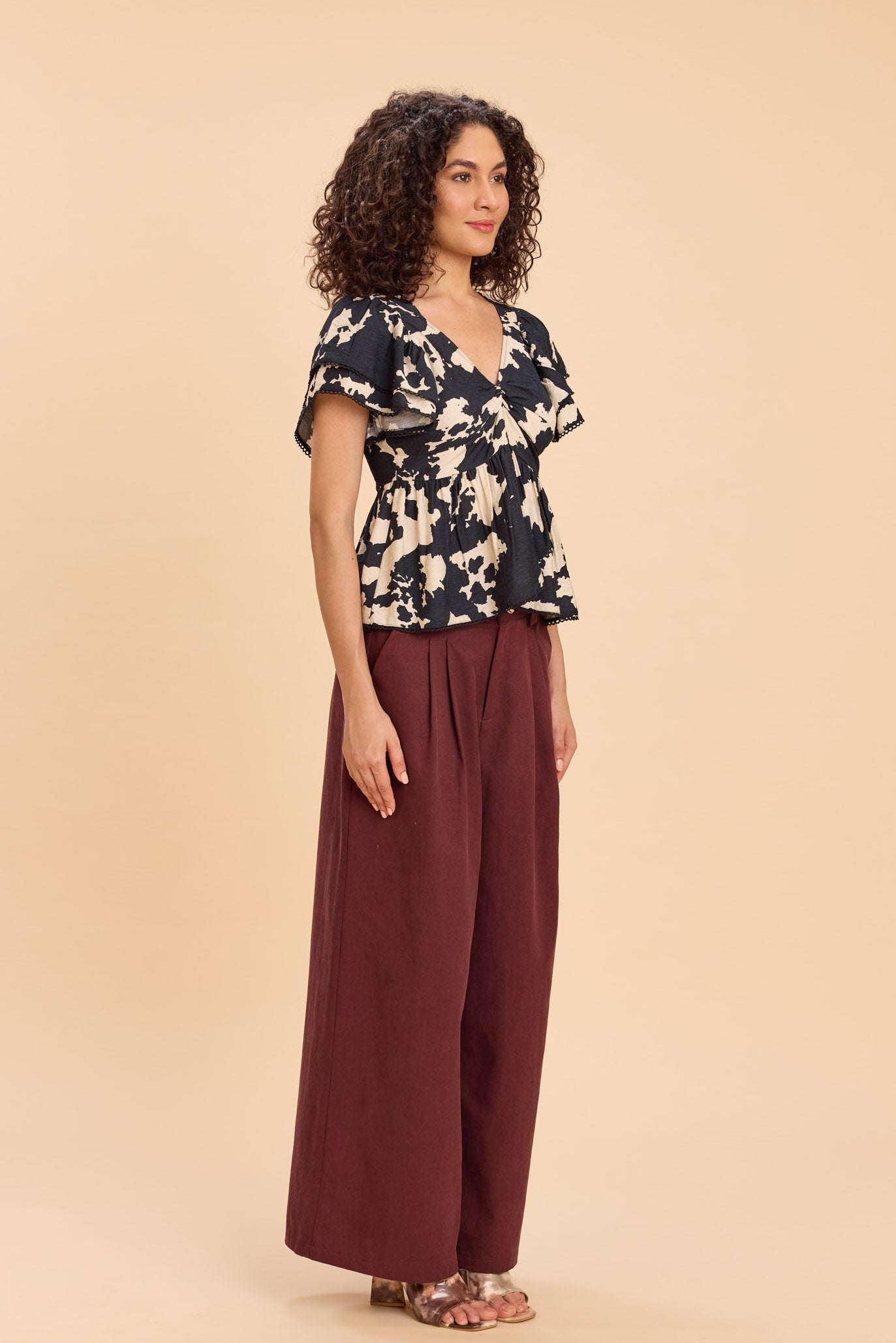CALI PRINTED PEPLUM TOP WITH TIERED ANGEL SLEEVES