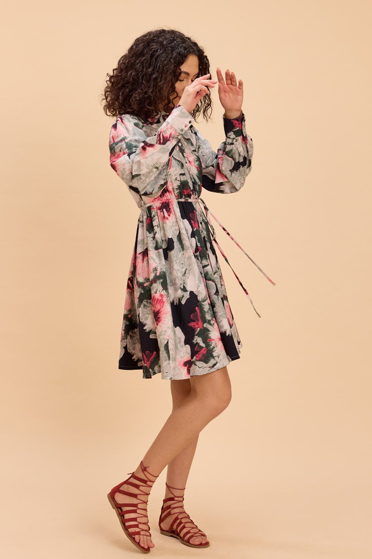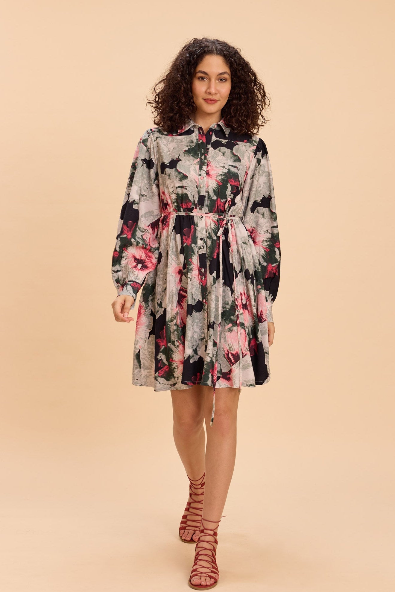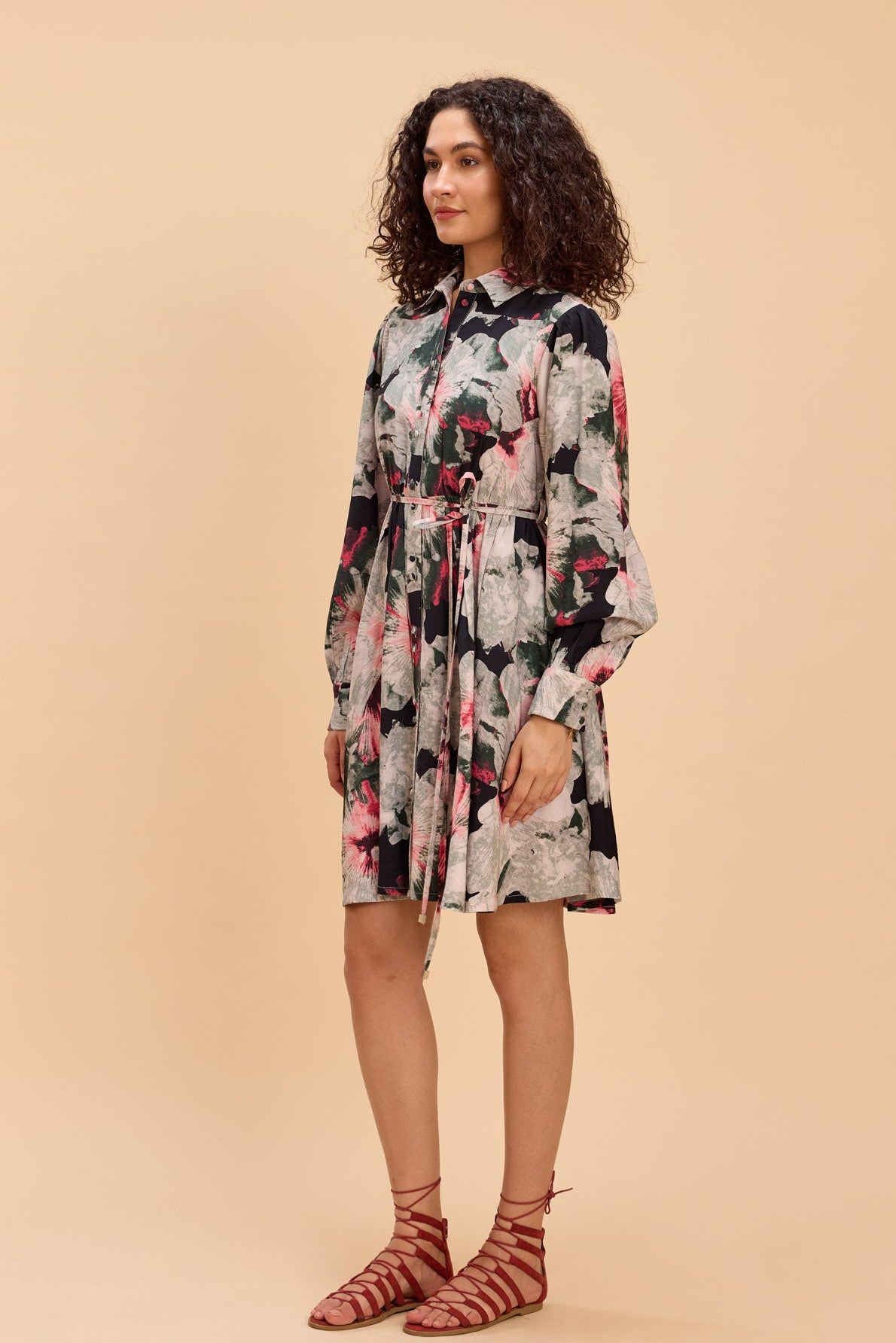 A bold watercolour floral print brings statement charm to this short shirt dress, crafted in a smooth viscose-nylon fabric with full sleeves and a flattering, easy length. Cinched at the waist with a self-fabric rope belt, it’s perfect for brunches, city days, vacations, or relaxed evenings out.