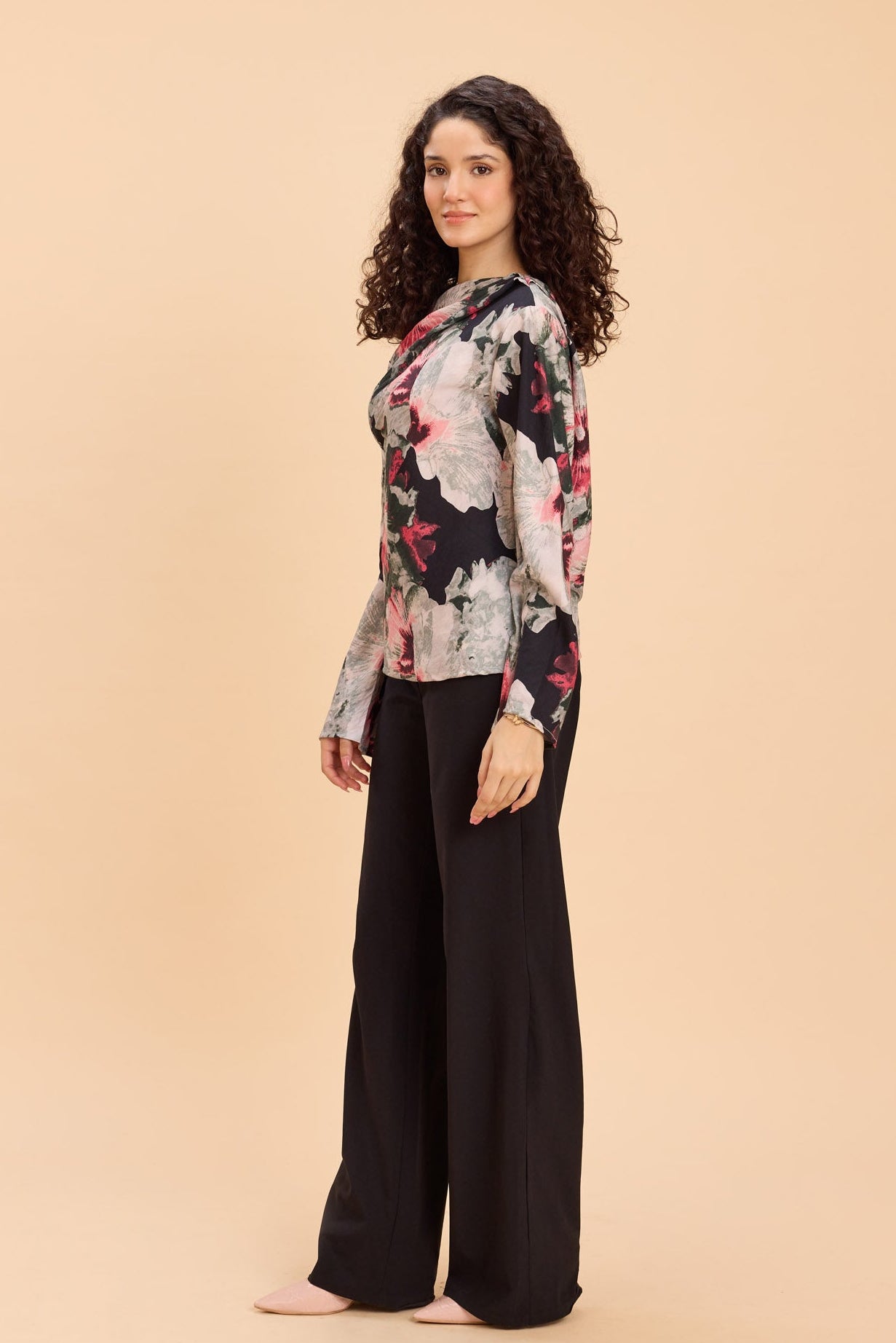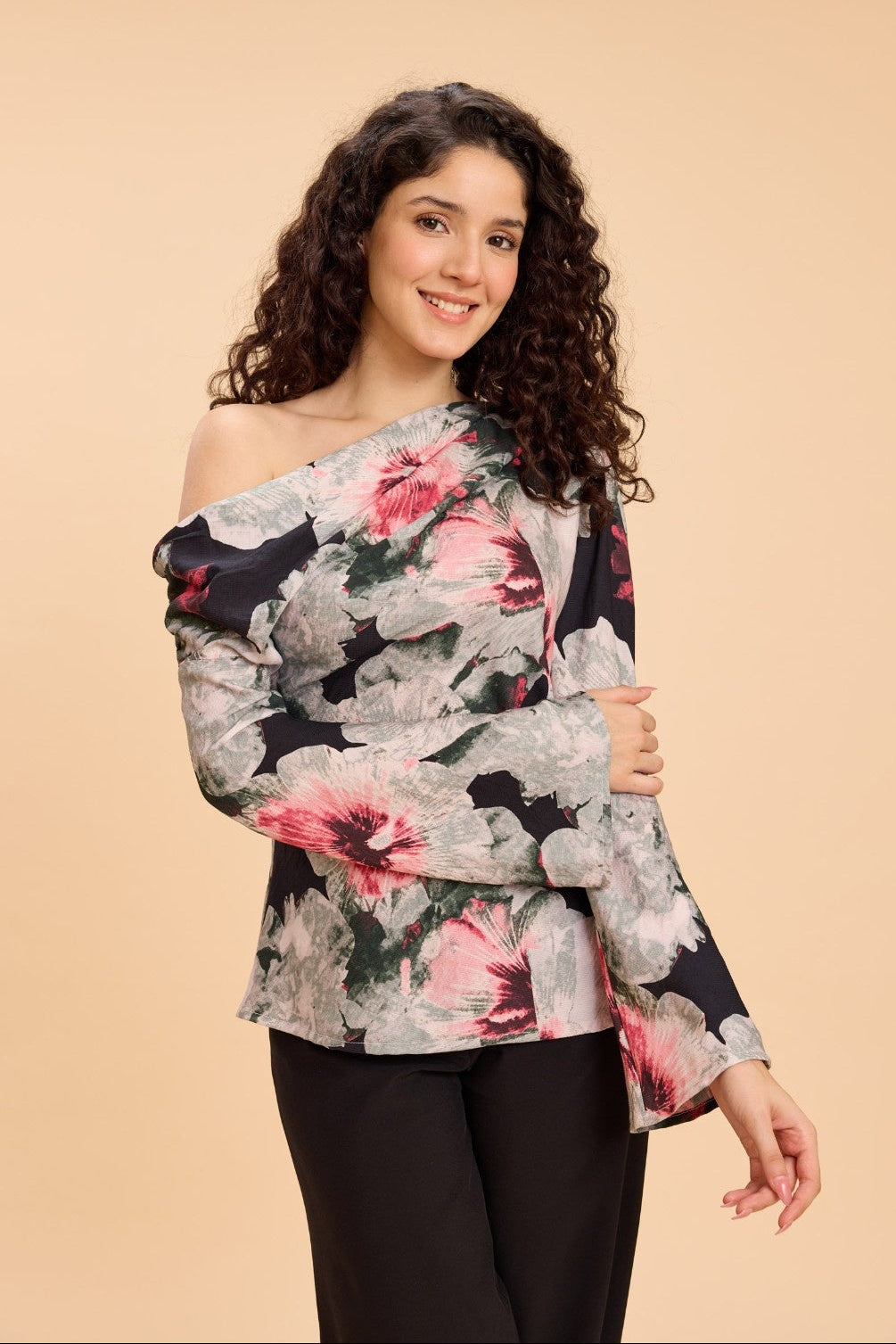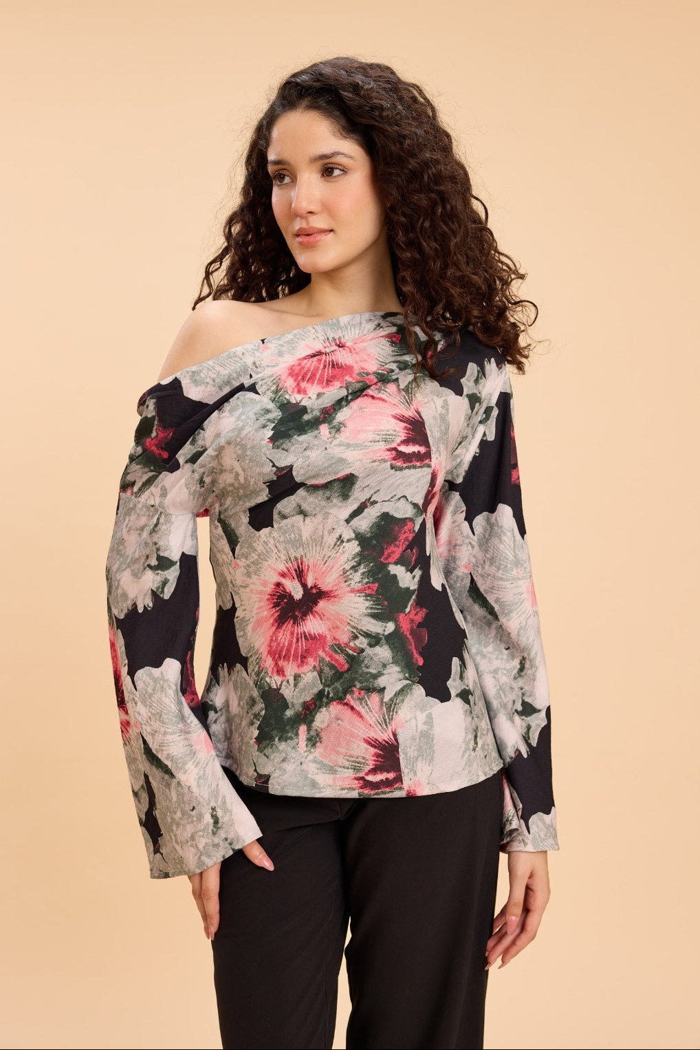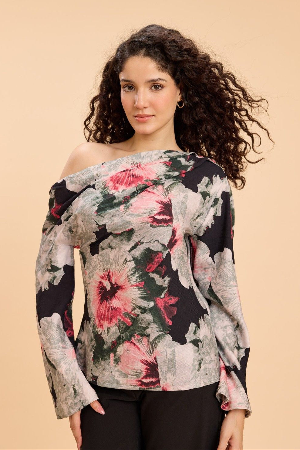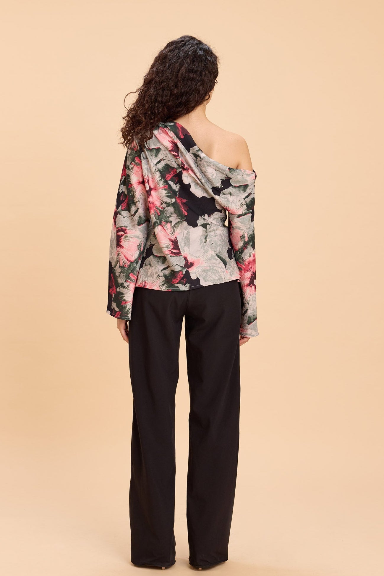 Turn heads in this one-shoulder top featuring a bold watercolor floral print, designed to elevate everything from brunch dates and art shows to cocktails and dinner plans. Crafted in a textured viscose-nylon fabric with an elevated sheen and luxe handfeel, it drapes beautifully while adding a polished, fashion-forward edge to your look.