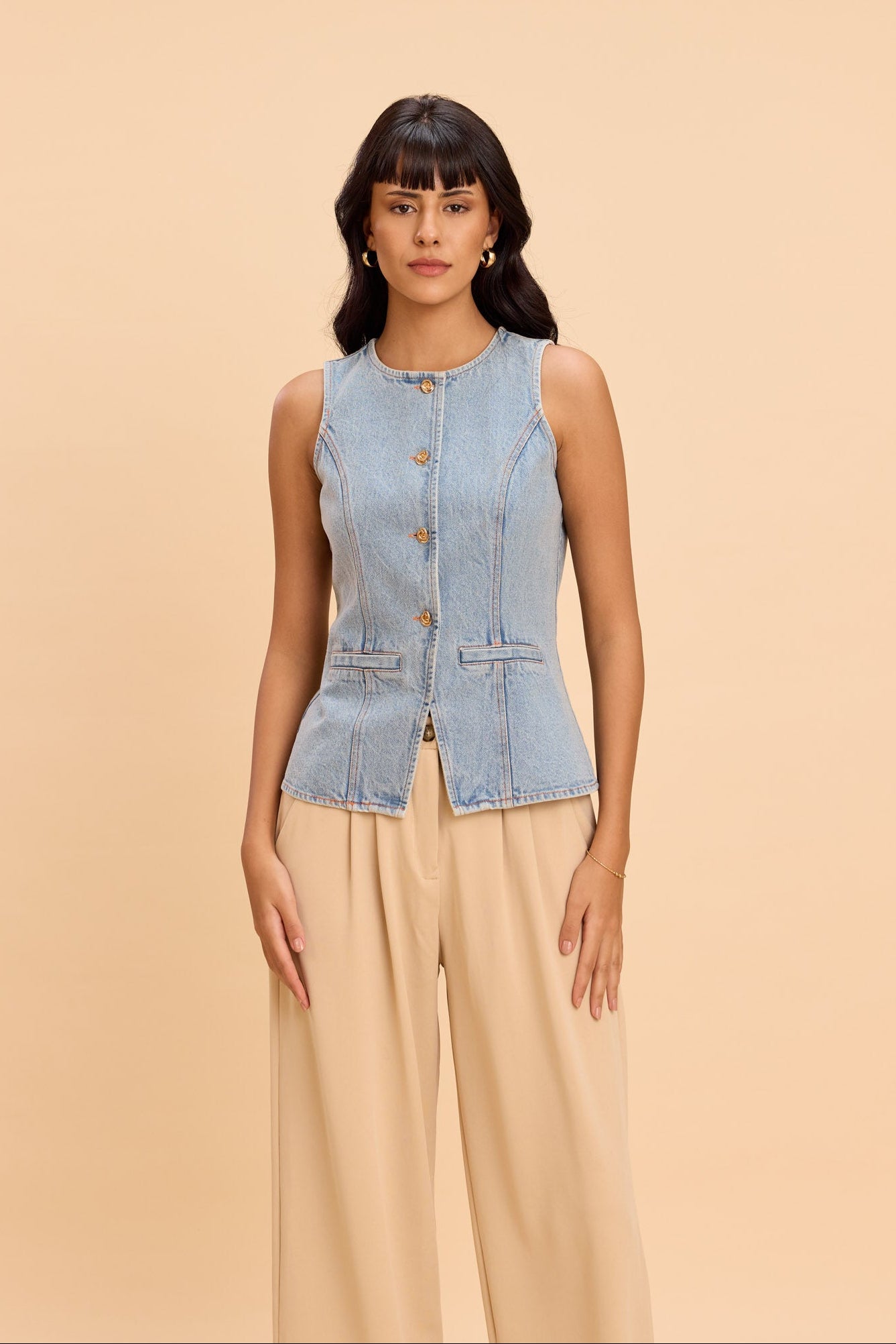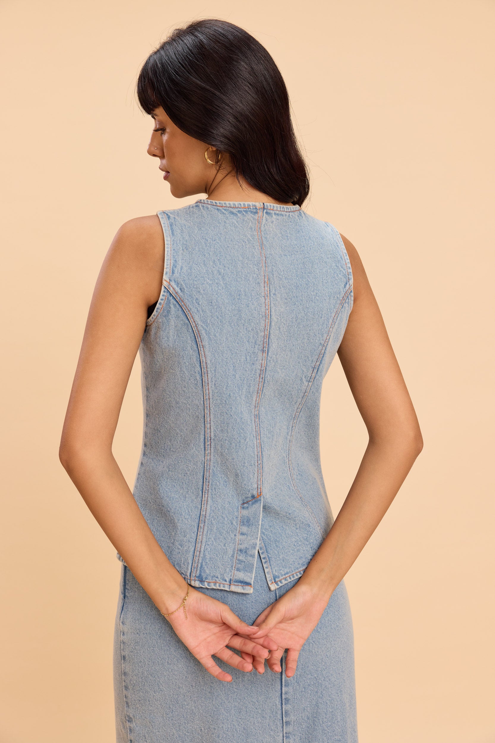 IRIS COTTON DENIM LONGLINE VEST WITH STATEMENT BUTTONS