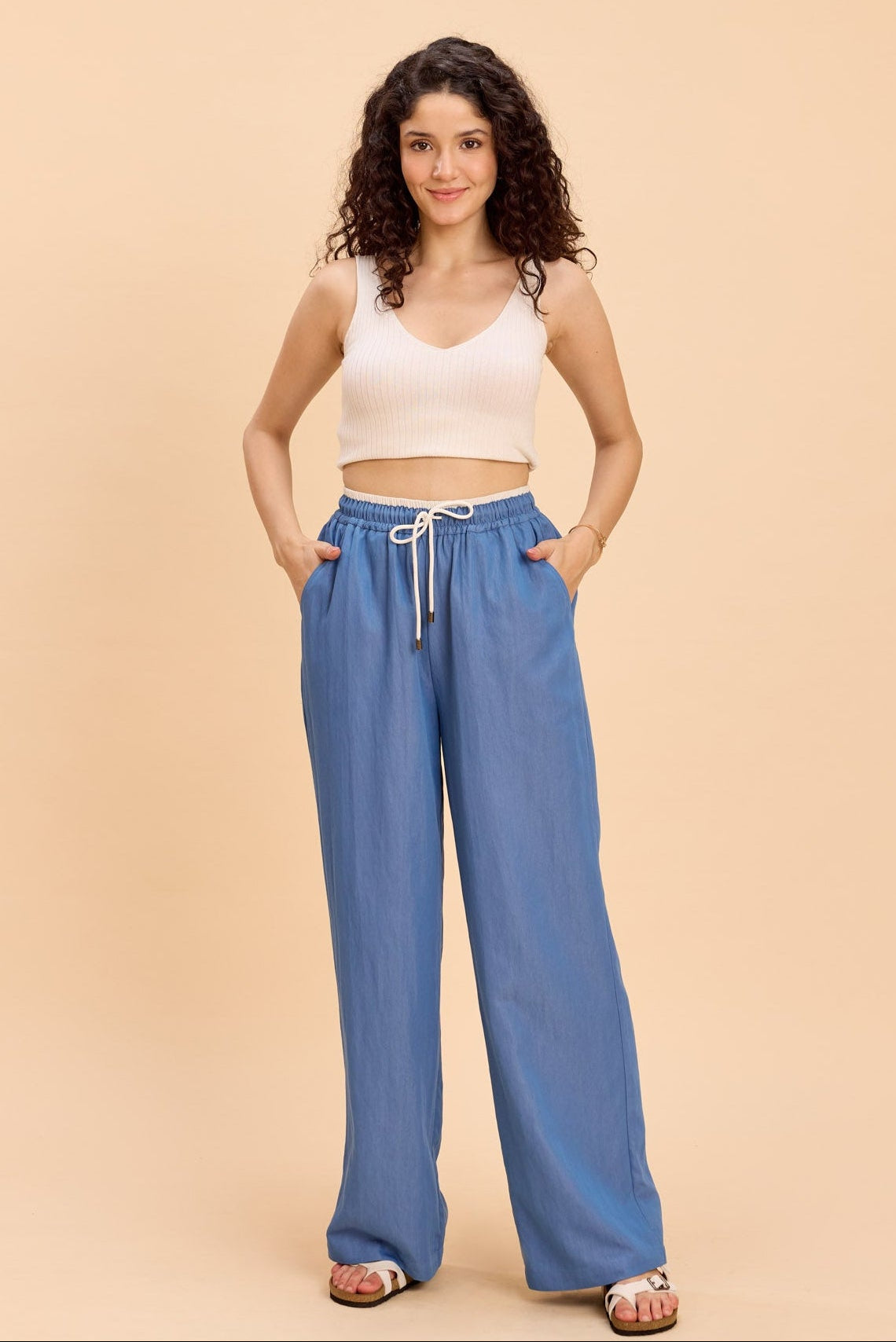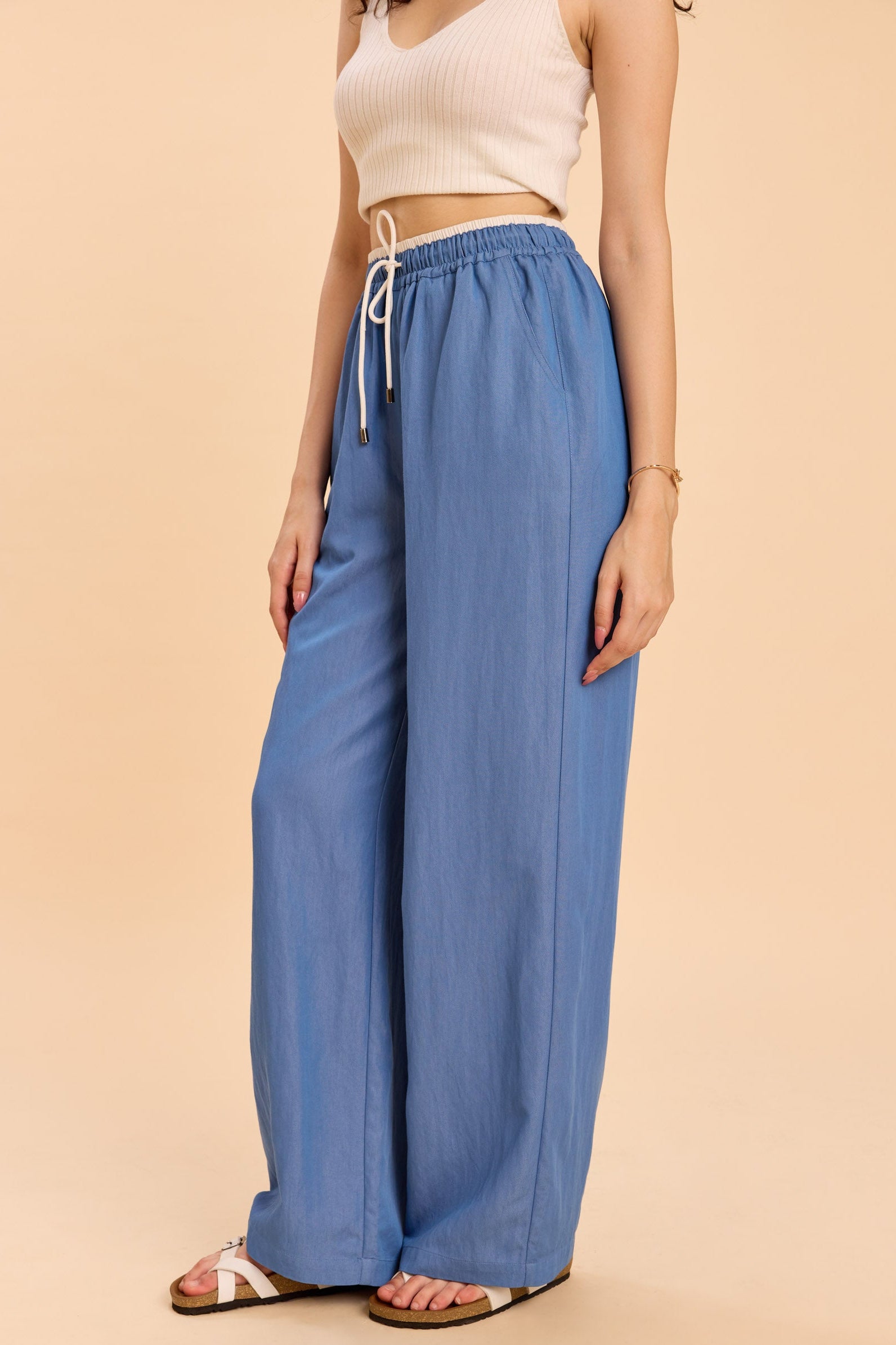ASTRID WIDE ANKLE DENIM PANTS WITH CONTRAST WAIST BAND