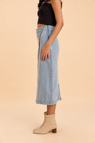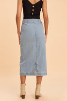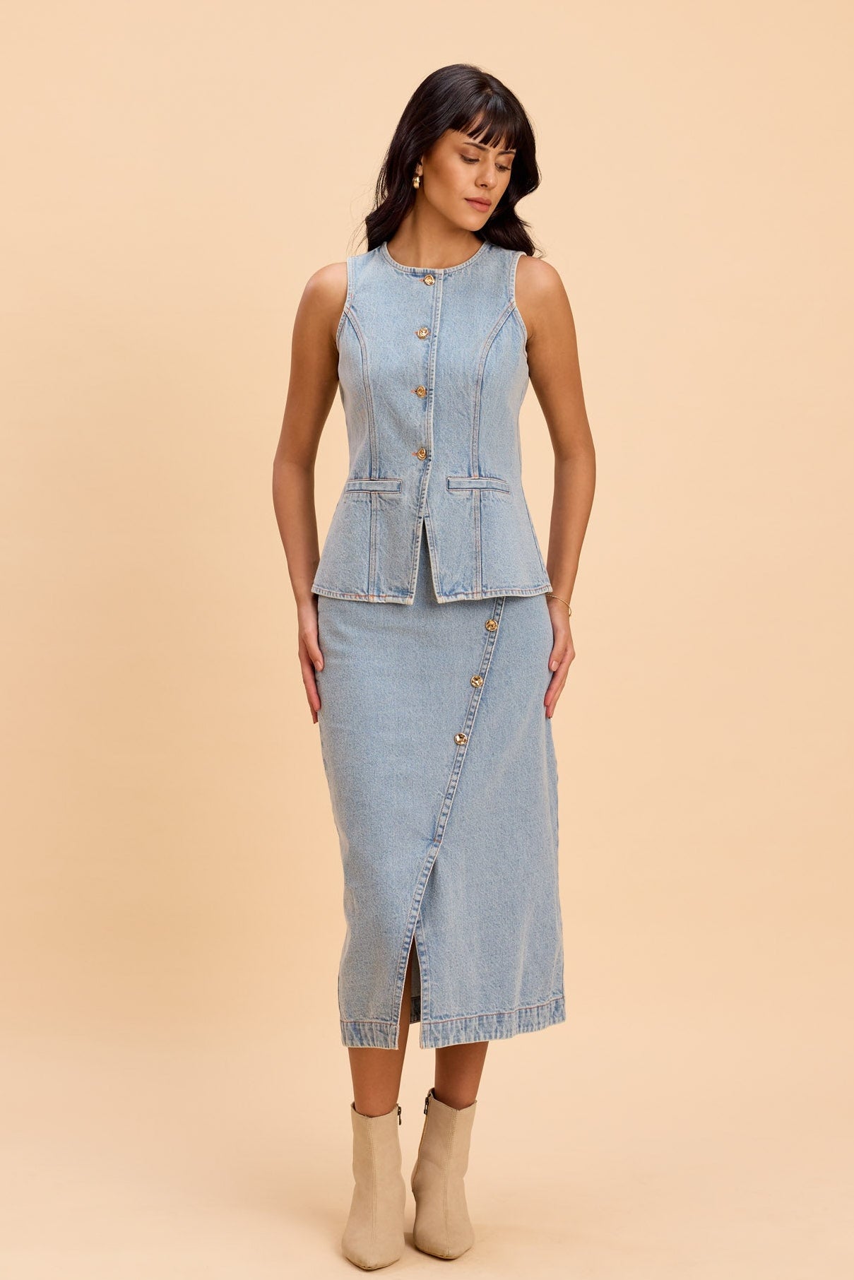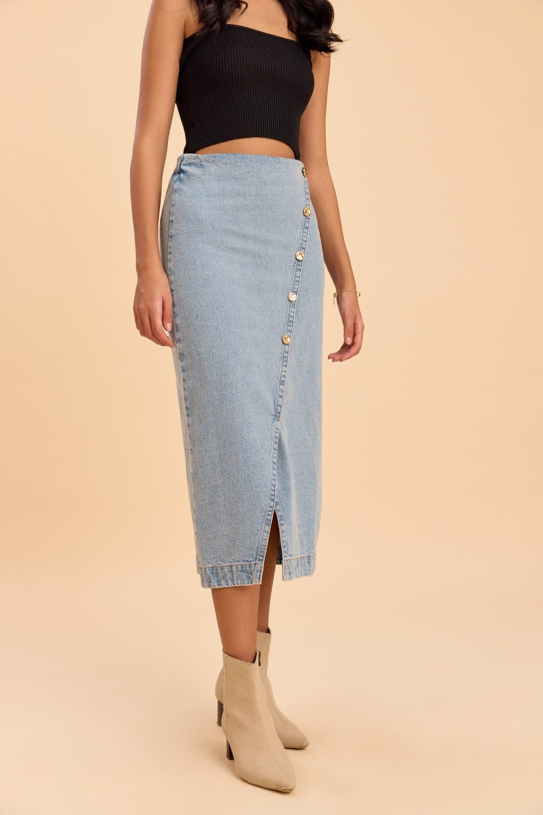 Midi-length denim skirt detailed with asymmetrical seams and a front vent finished with golden trim buttons