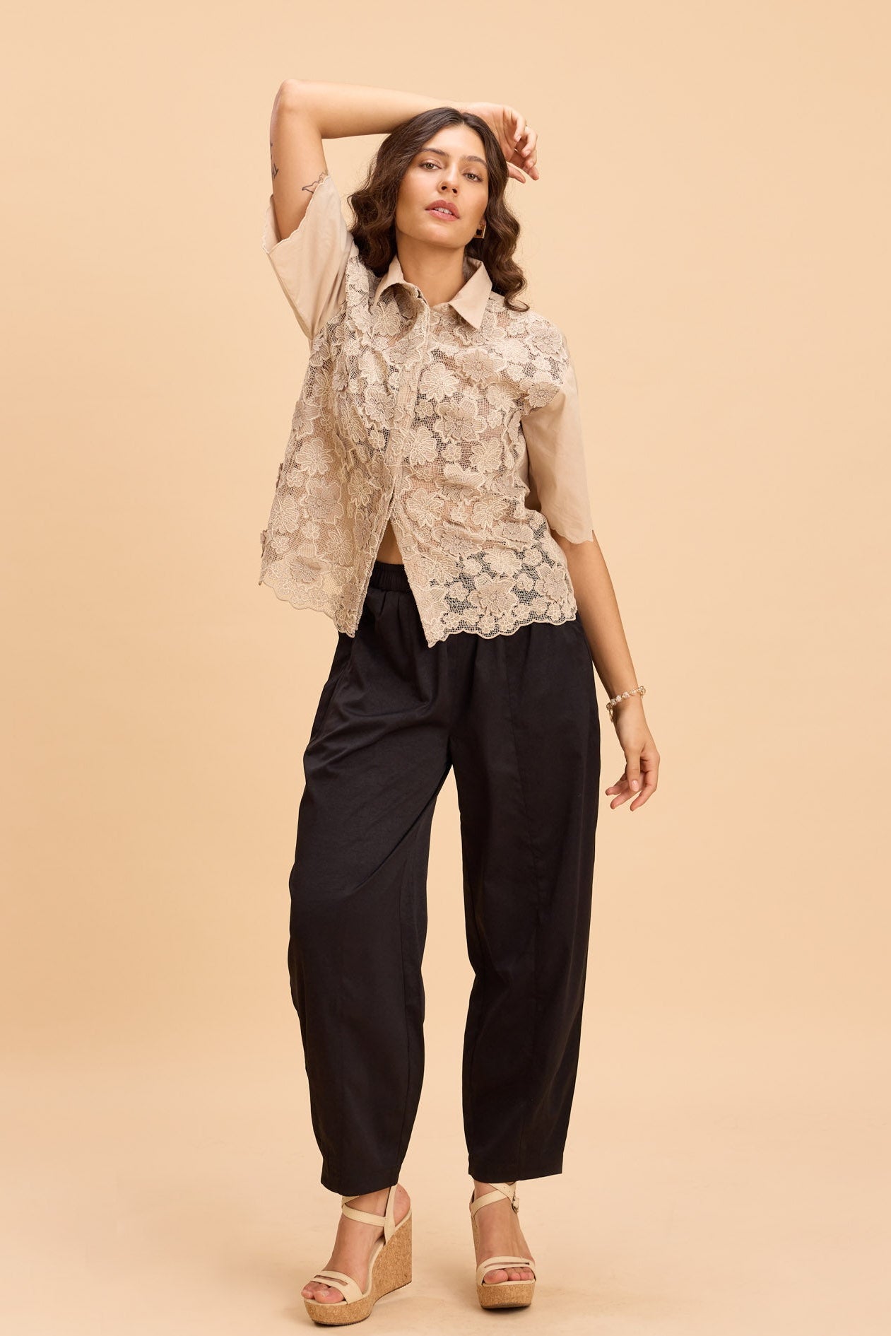 Designed to make a statement, this short-sleeve shirt features intricate 3D floral lace at the front with a concealed placket, balanced by solid cotton poplin sleeves and back for effortless comfort. Finished with a delicate scalloped hemline, it’s perfect for workdays, brunch dates, festive lunches, or polished evening outings.