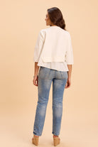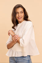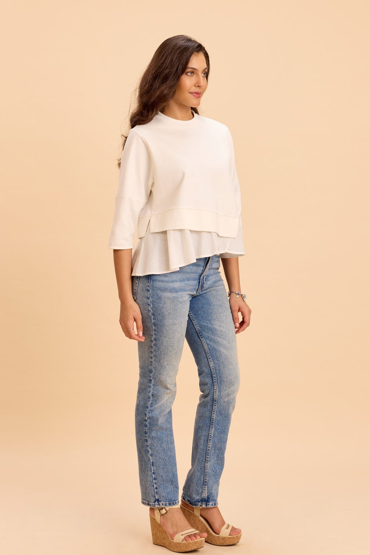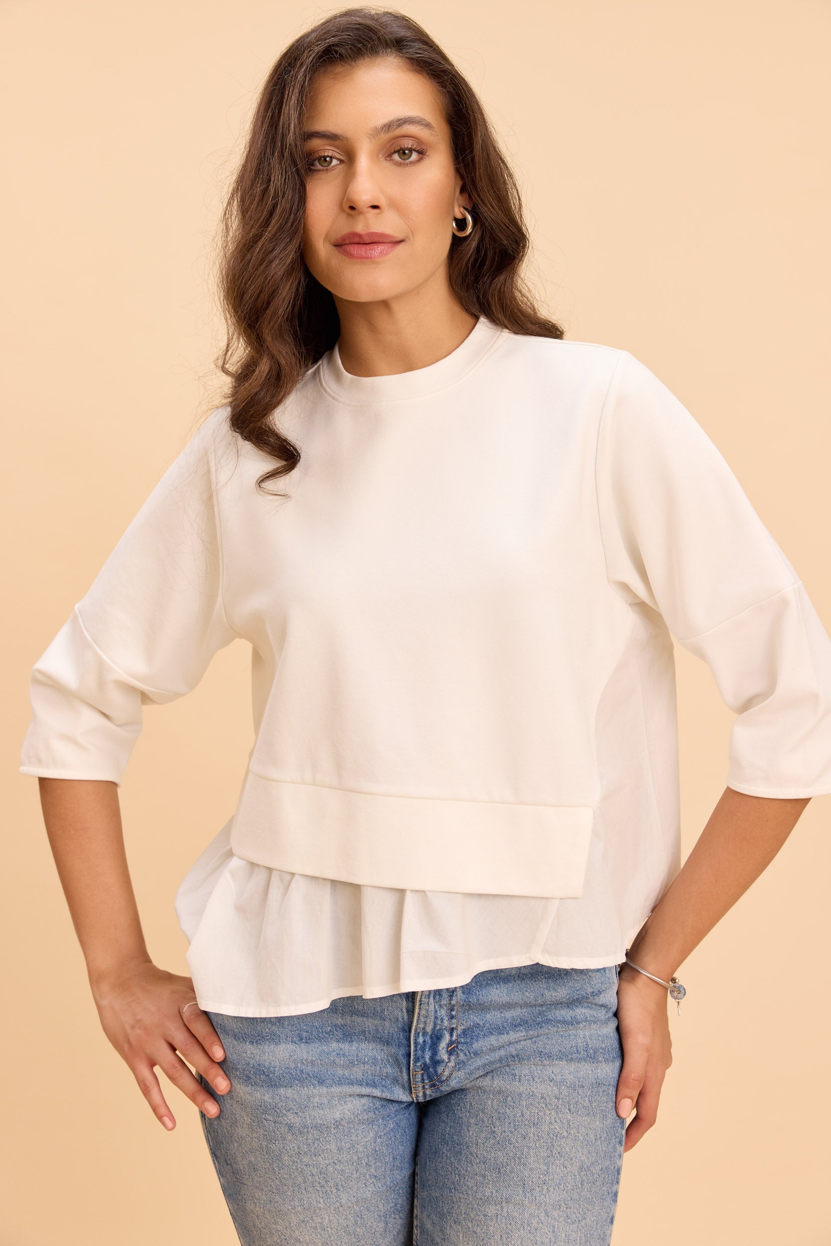 Sweatshirt with asymmetrical detailing featuring poplin underlayer peplum with crew neck and structured drape