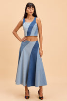 A cotton denim color-block co-ord set featuring a crop top and matching A-line long skirt, both finished with sleek side-zip detailing