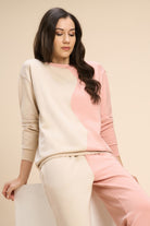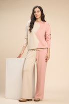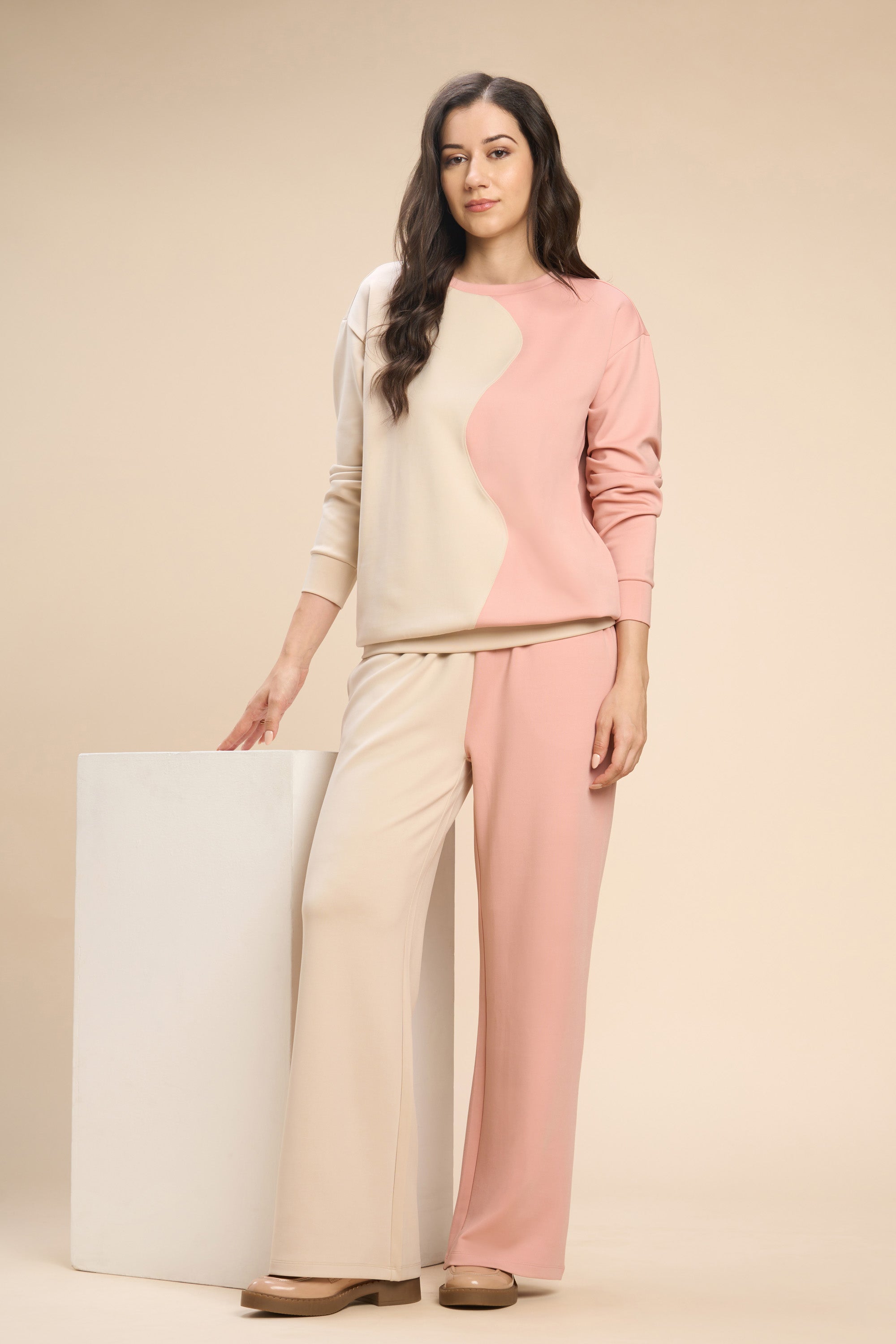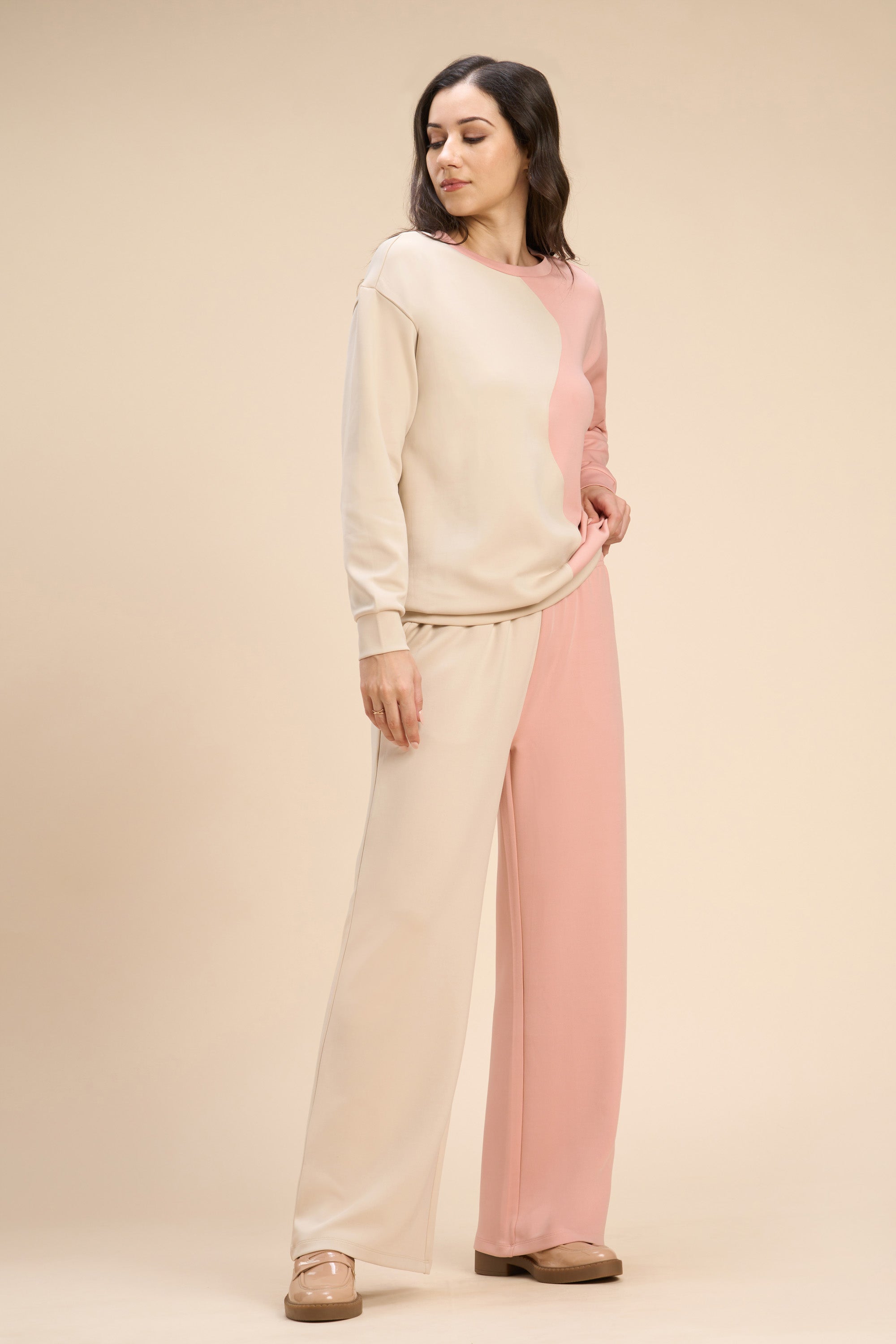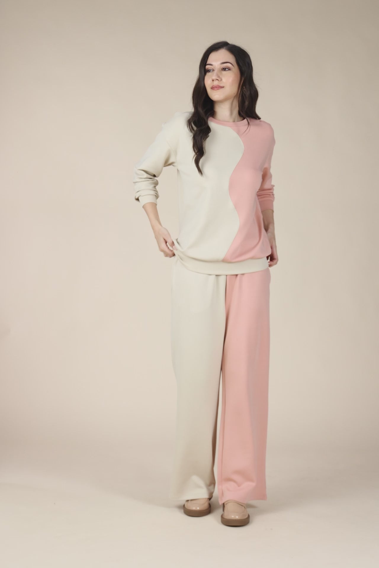 Make a style statement in this sweat co-ord set, designed with a playful two-tone colour-block look paired with easy wide-leg pants. Perfect for travel days, airport looks, casual brunches, or relaxed everyday wear, it’s an effortless outfit you’ll keep reaching for.