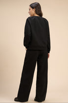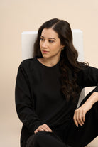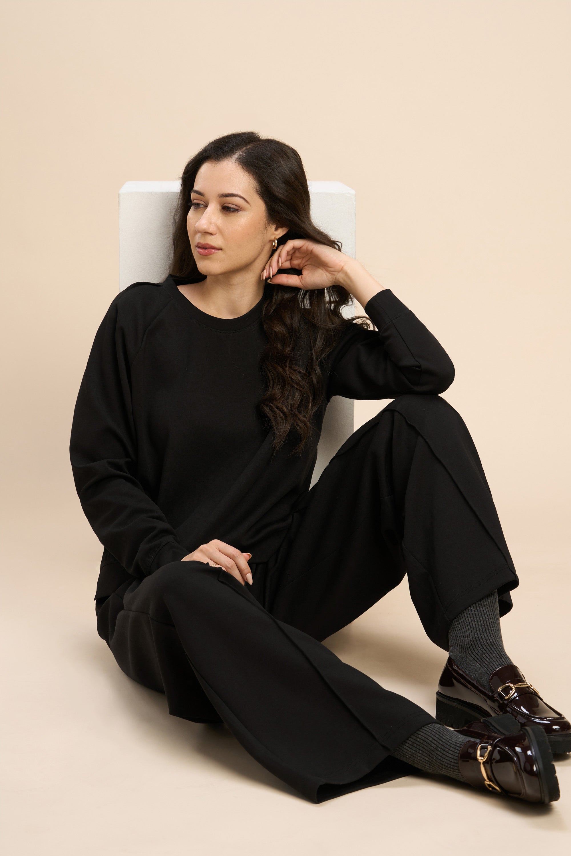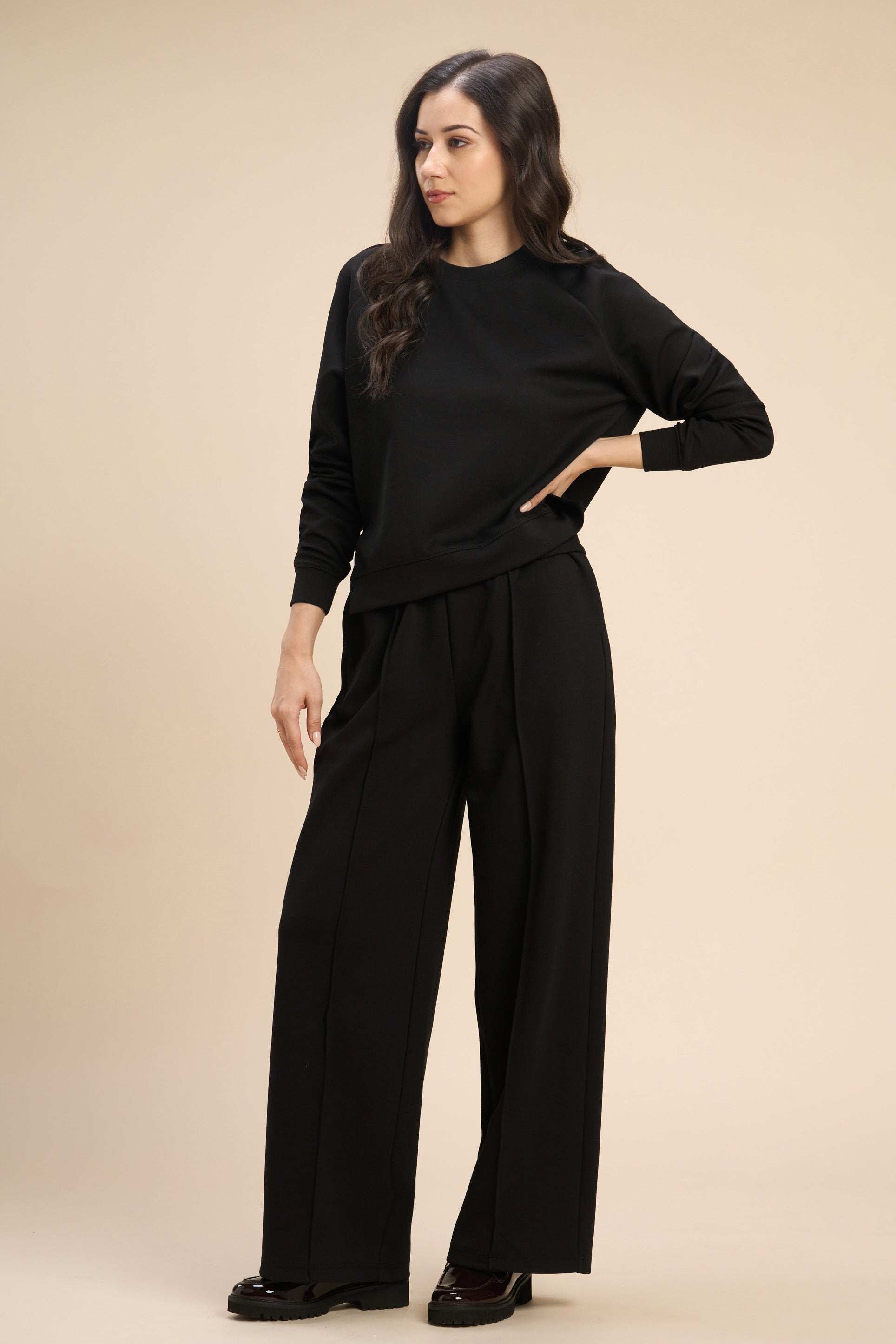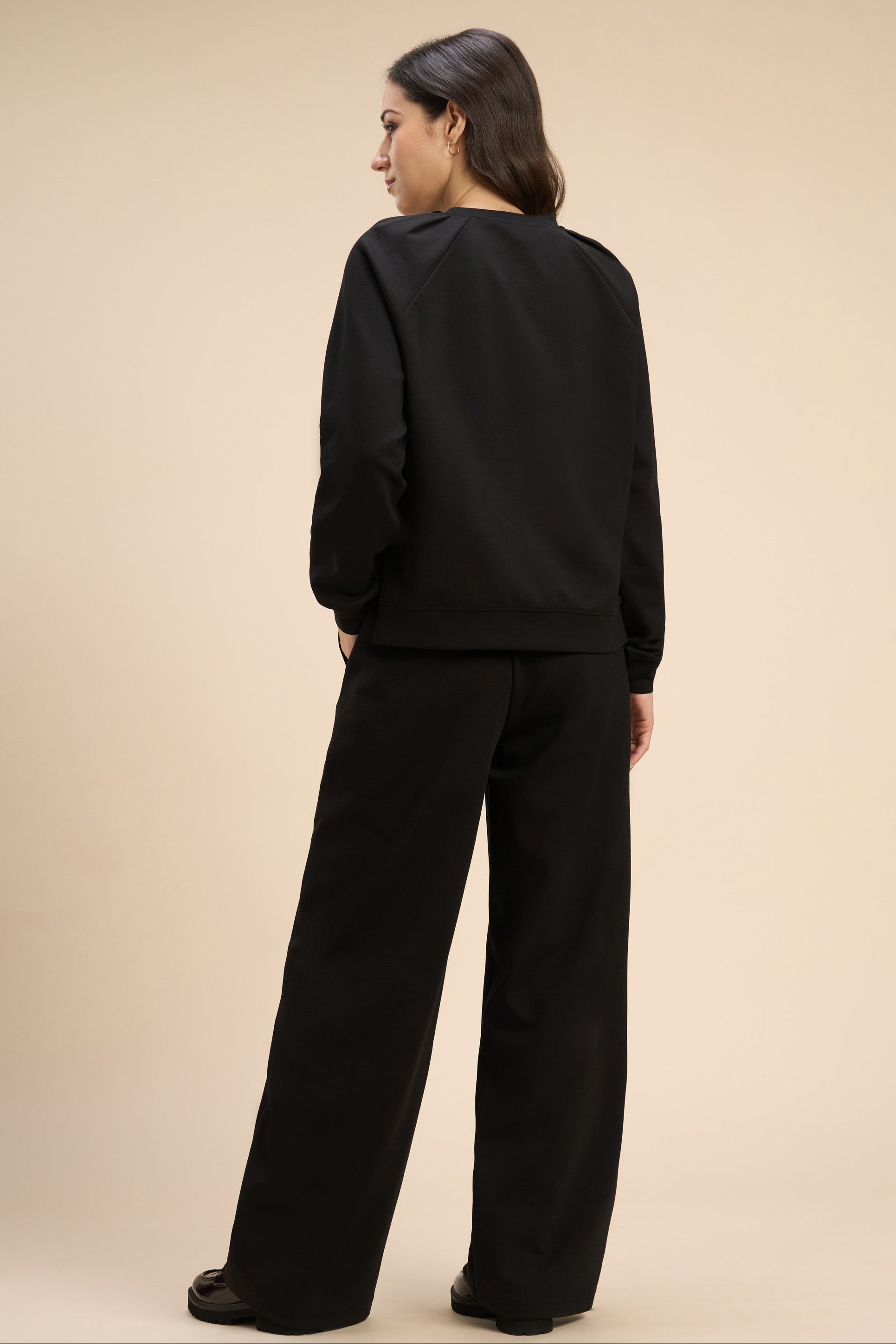 Effortlessly cool, this sweat co-ord set features a box pleat detail on the shoulder to add character, paired with relaxed wide-leg pants for a modern silhouette. Style it for travel days, work-from-home looks, city errands, or laid-back evenings, it’s your go-to set for elevated comfort and style.