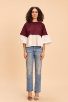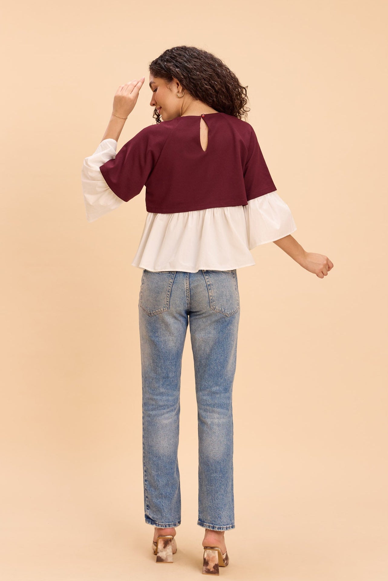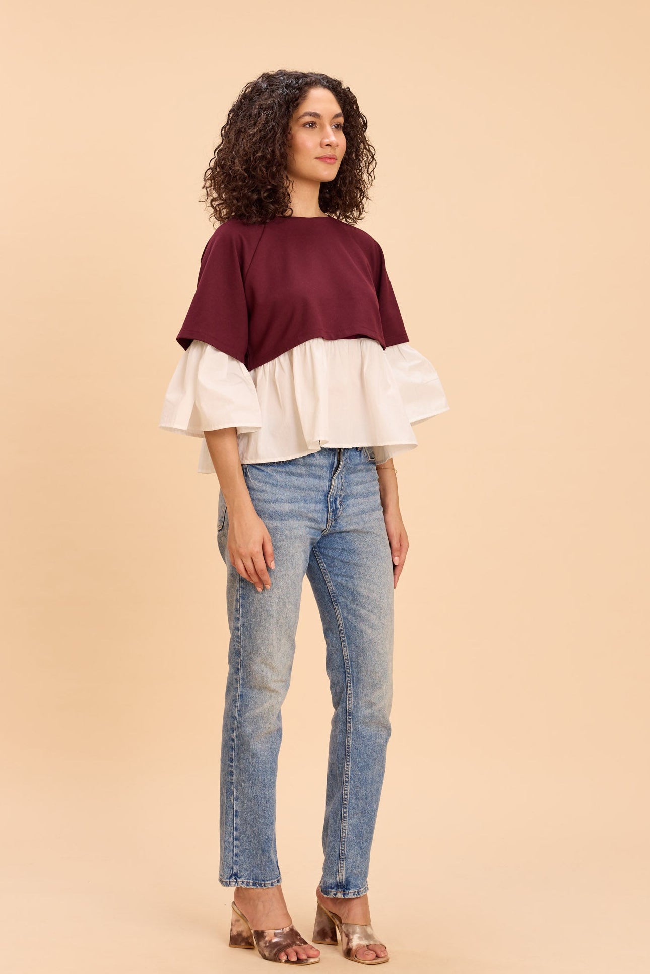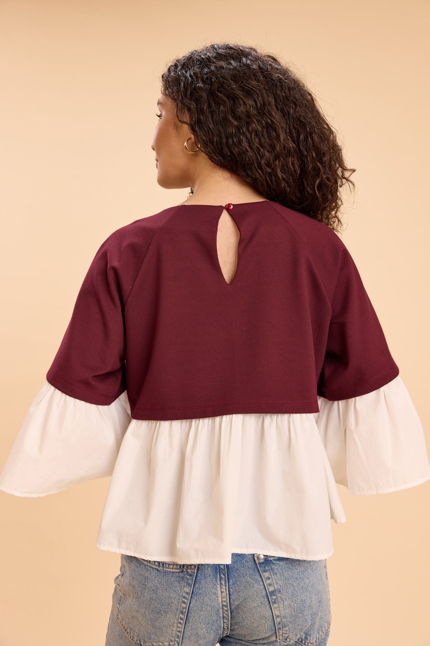 Cropped sweatshirt with gathered peplum hem designed with poplin bell-sleeves underlayer and raglan seam highlighting volume contrast