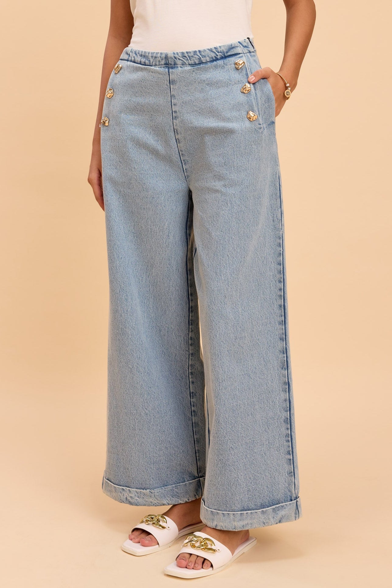 Relaxed wide ankle-length pants with an elasticated waistband and trim detailing along the side pockets