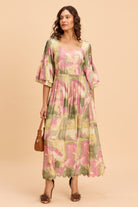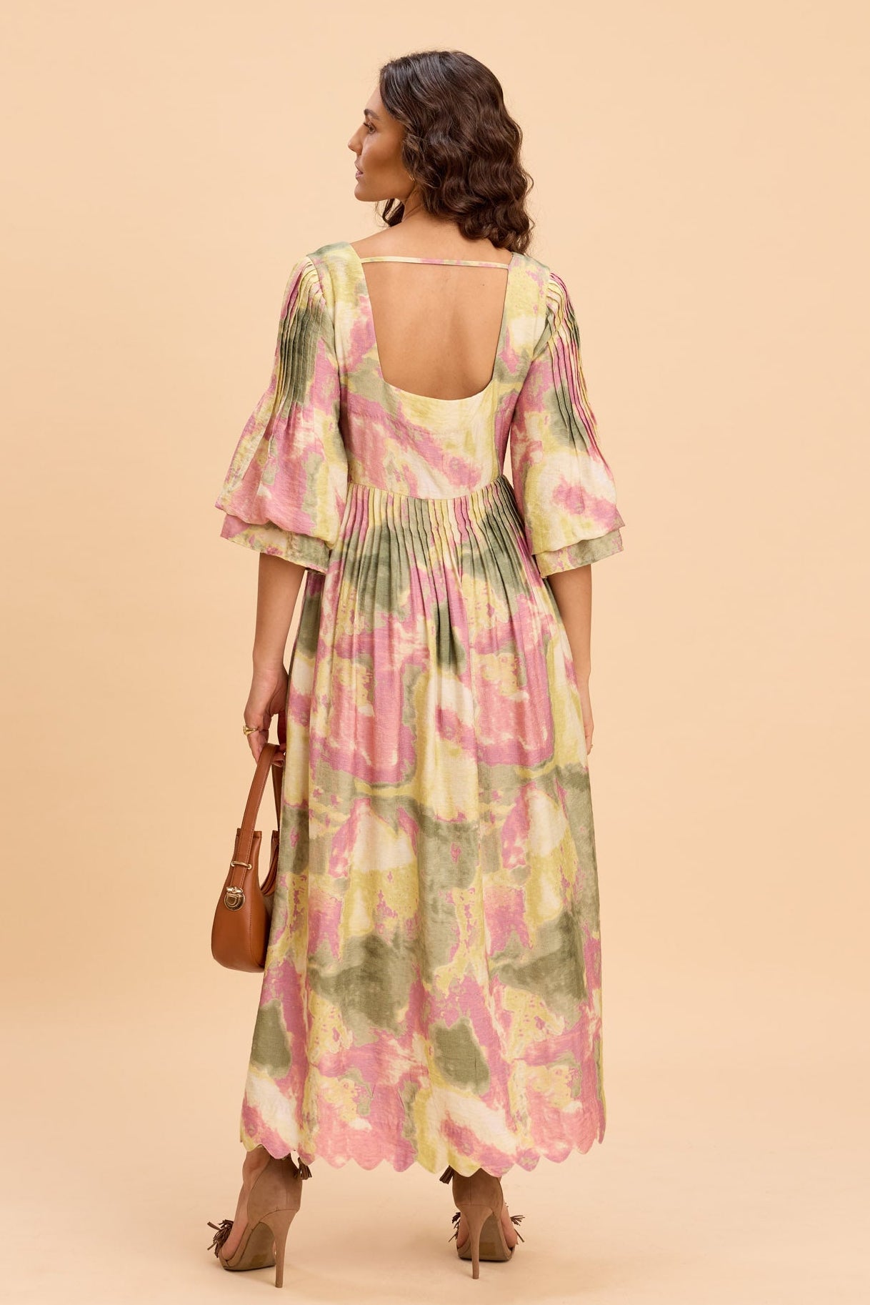 Printed Midi Flared Dress with sweetheart neckline and fine pleated detailing on the shoulders and waist