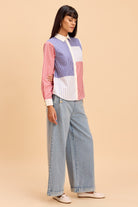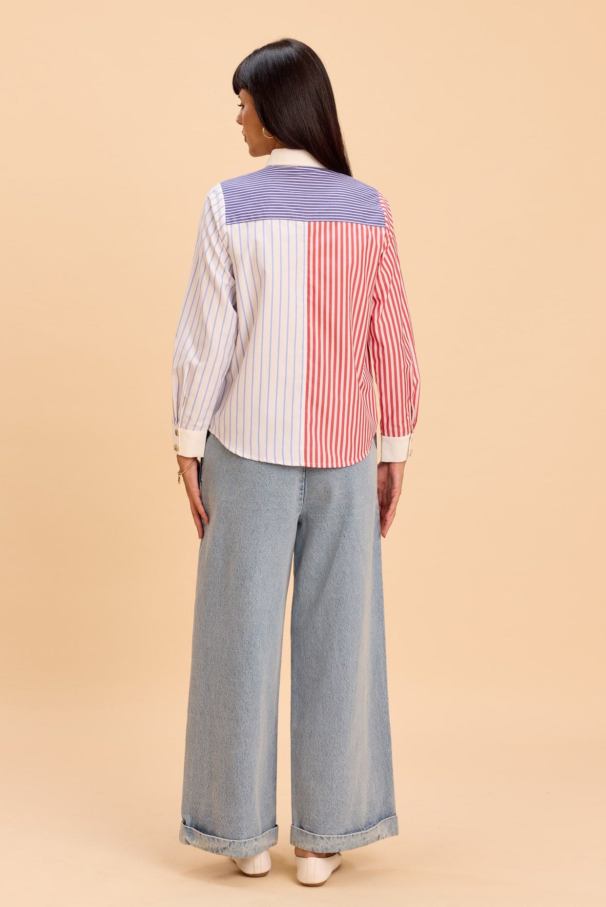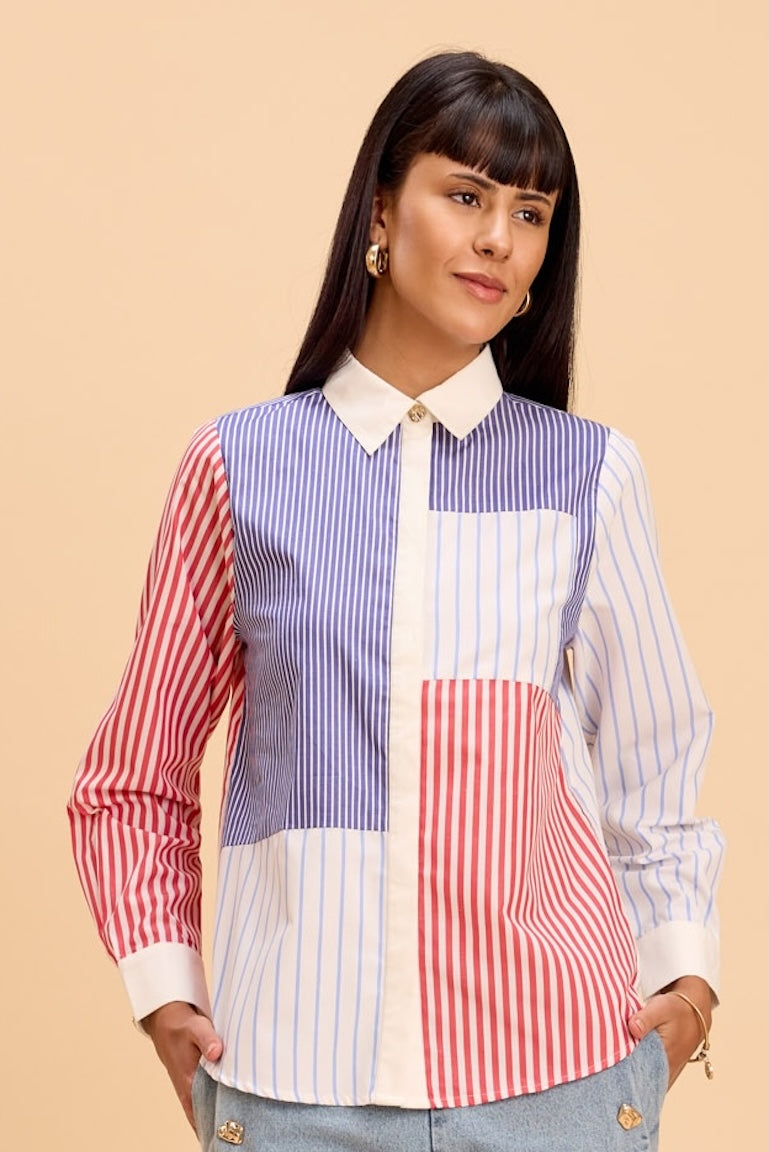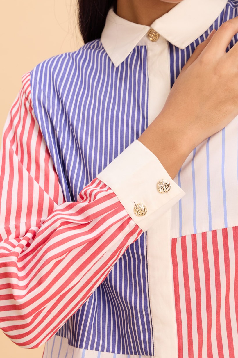 Colour-blocked button down stripe shirt with a classic collar, concealed placket and statement gold button on cuffs.