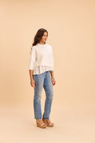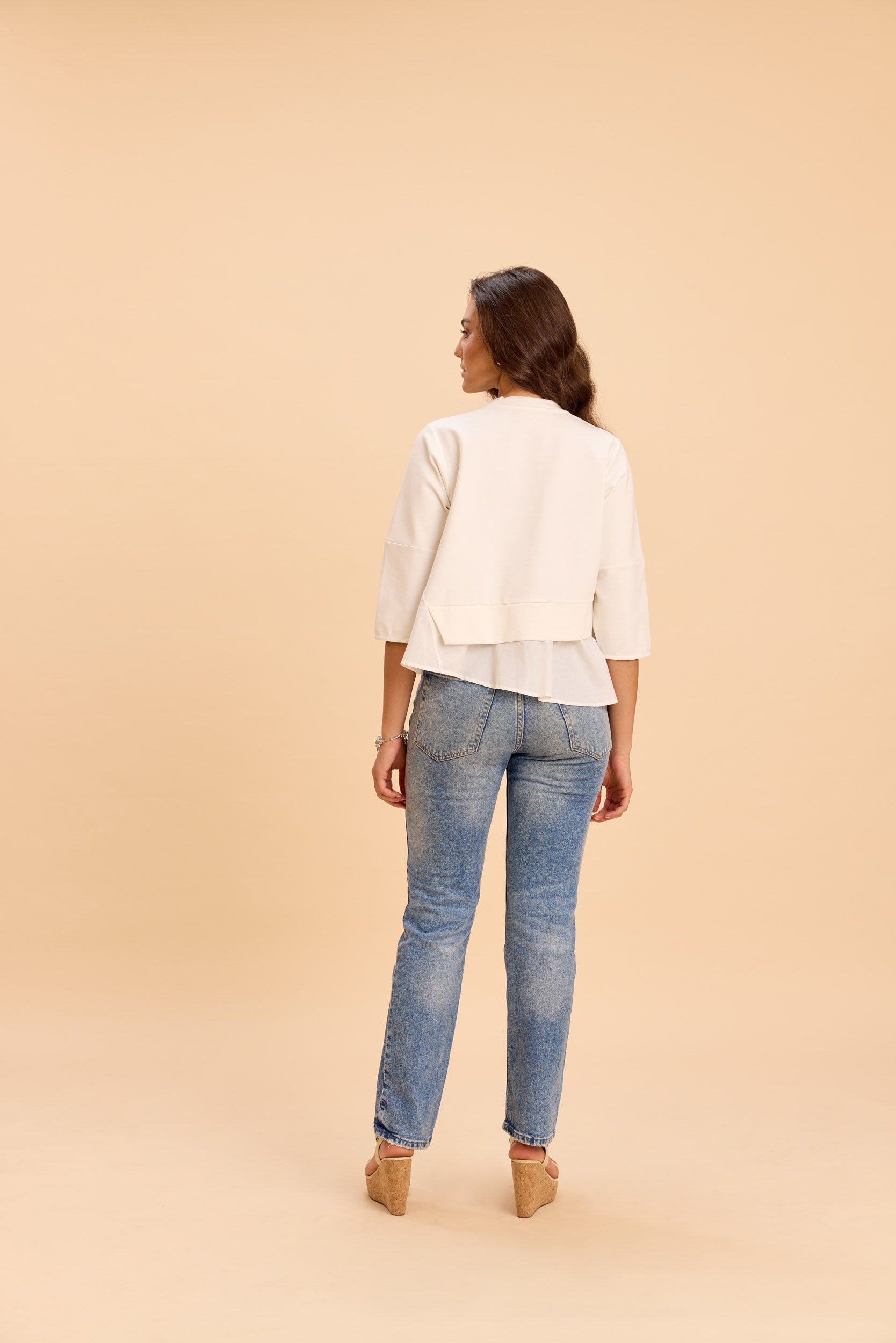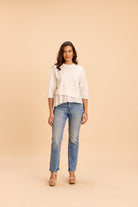Concealed button-down shirt with full sleeves and adjustable drawstring ruching on both sides for a cinched silhouette