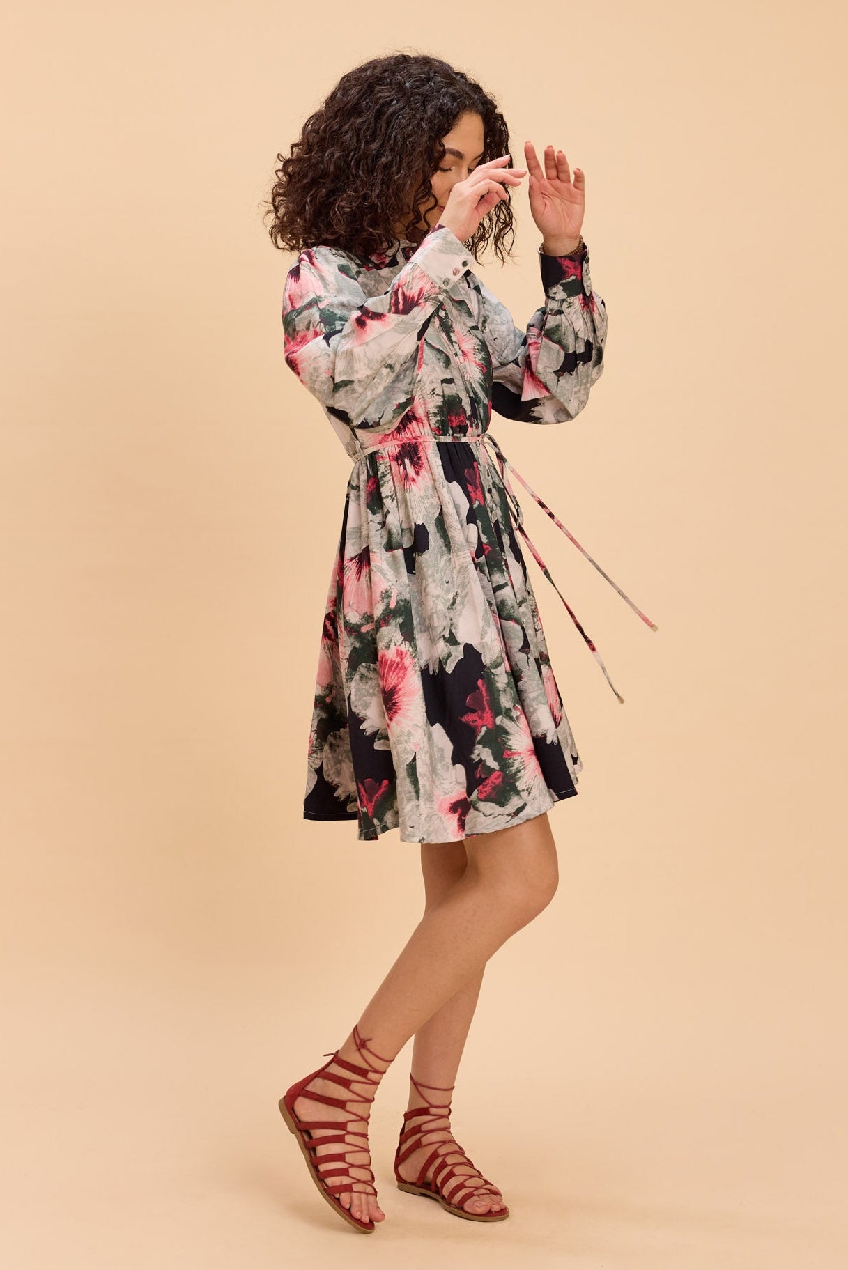 Printed Shirtdress with classic collar and concealed placket featuring detachable self-fabric belt and flared mini hem