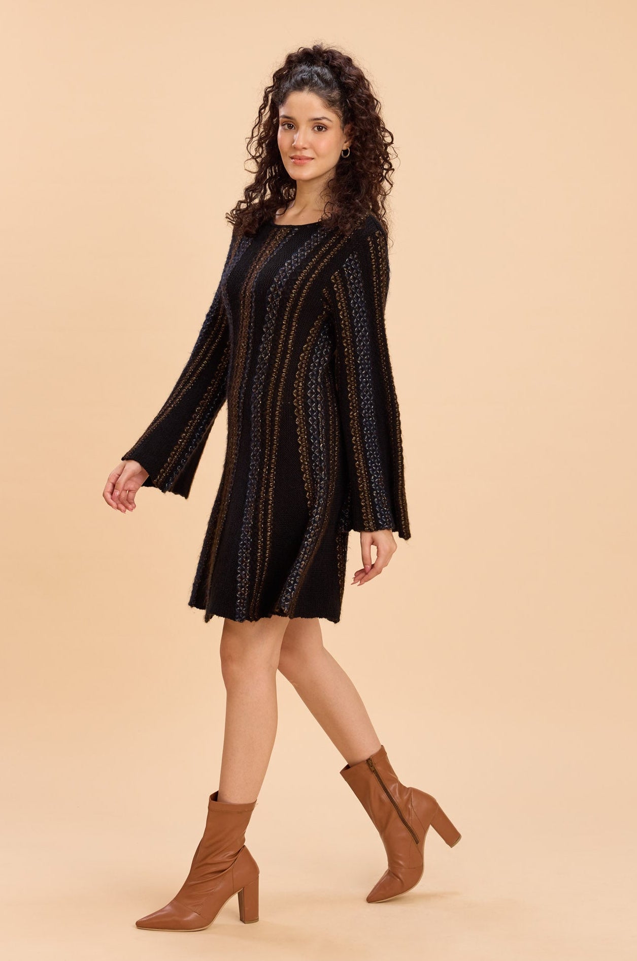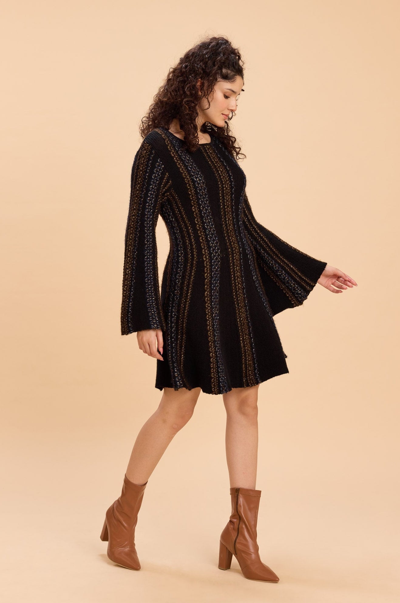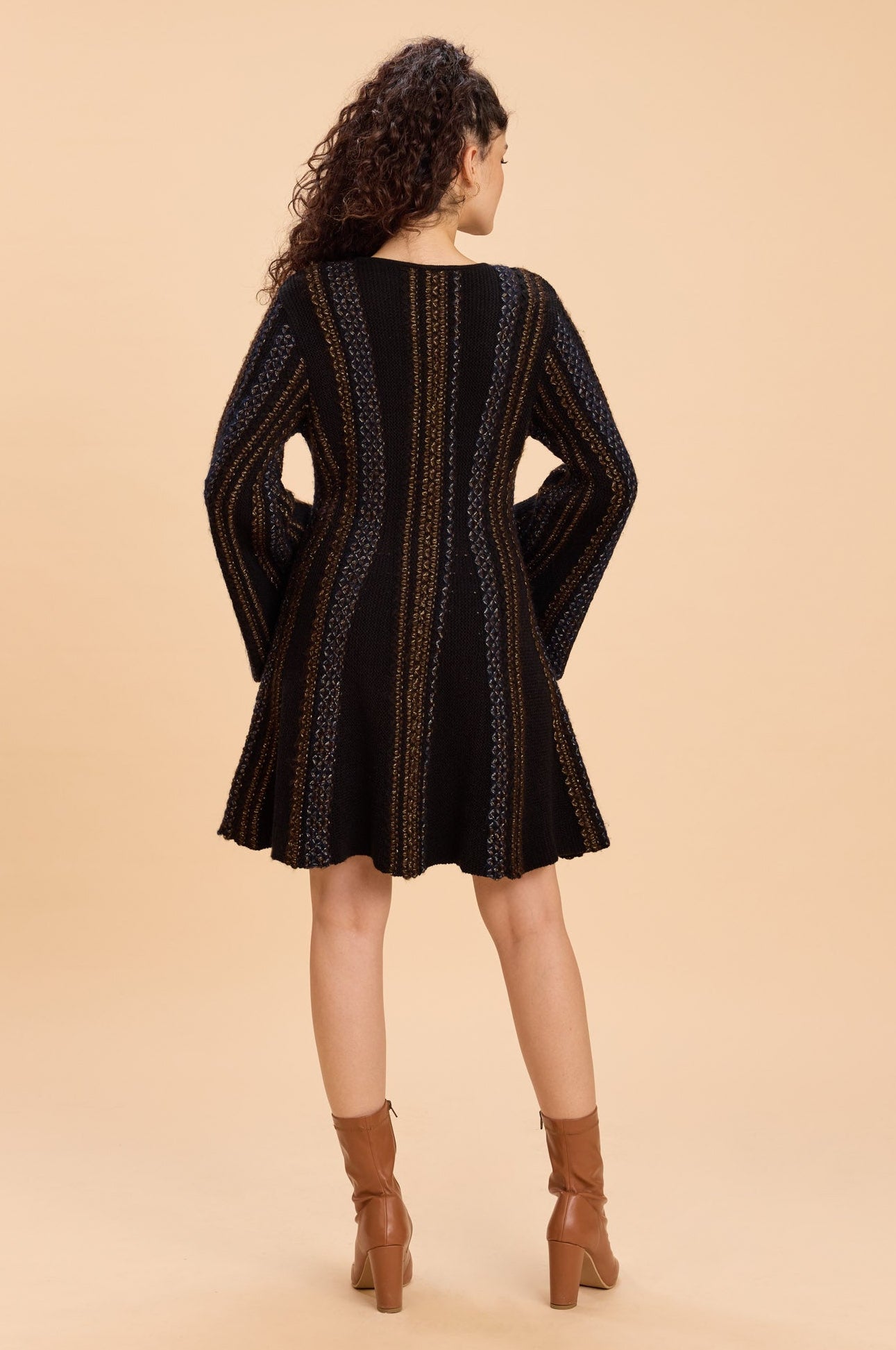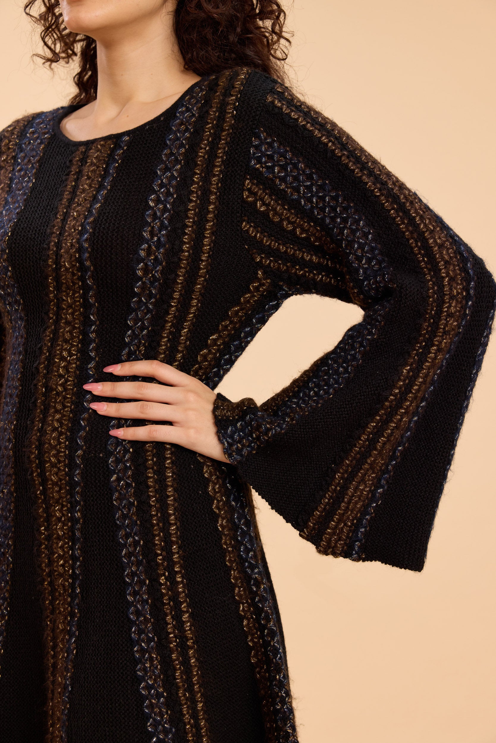 A line sweater dress in mid-gauge lurex-blend knit with vertical ribbed panels