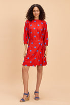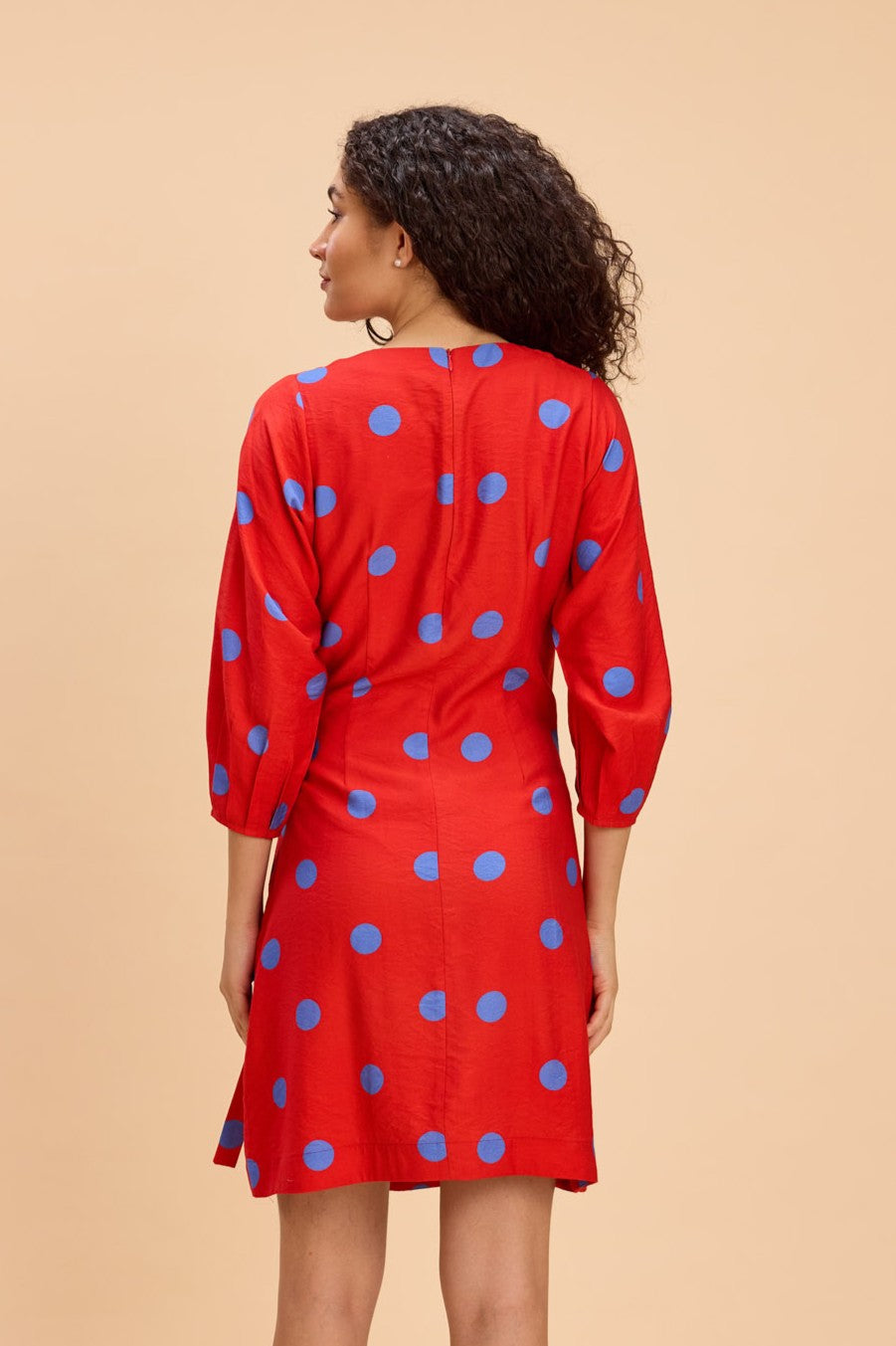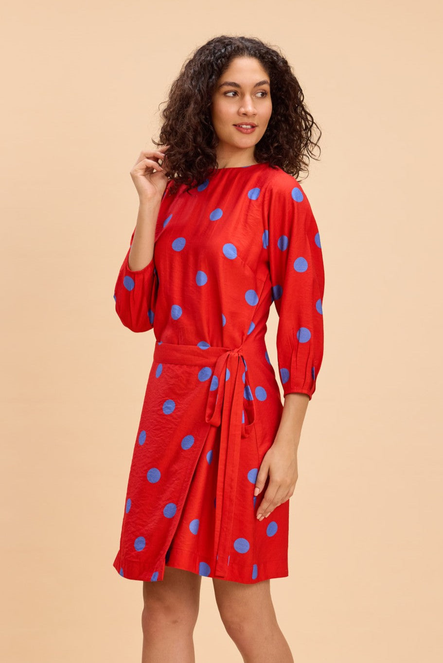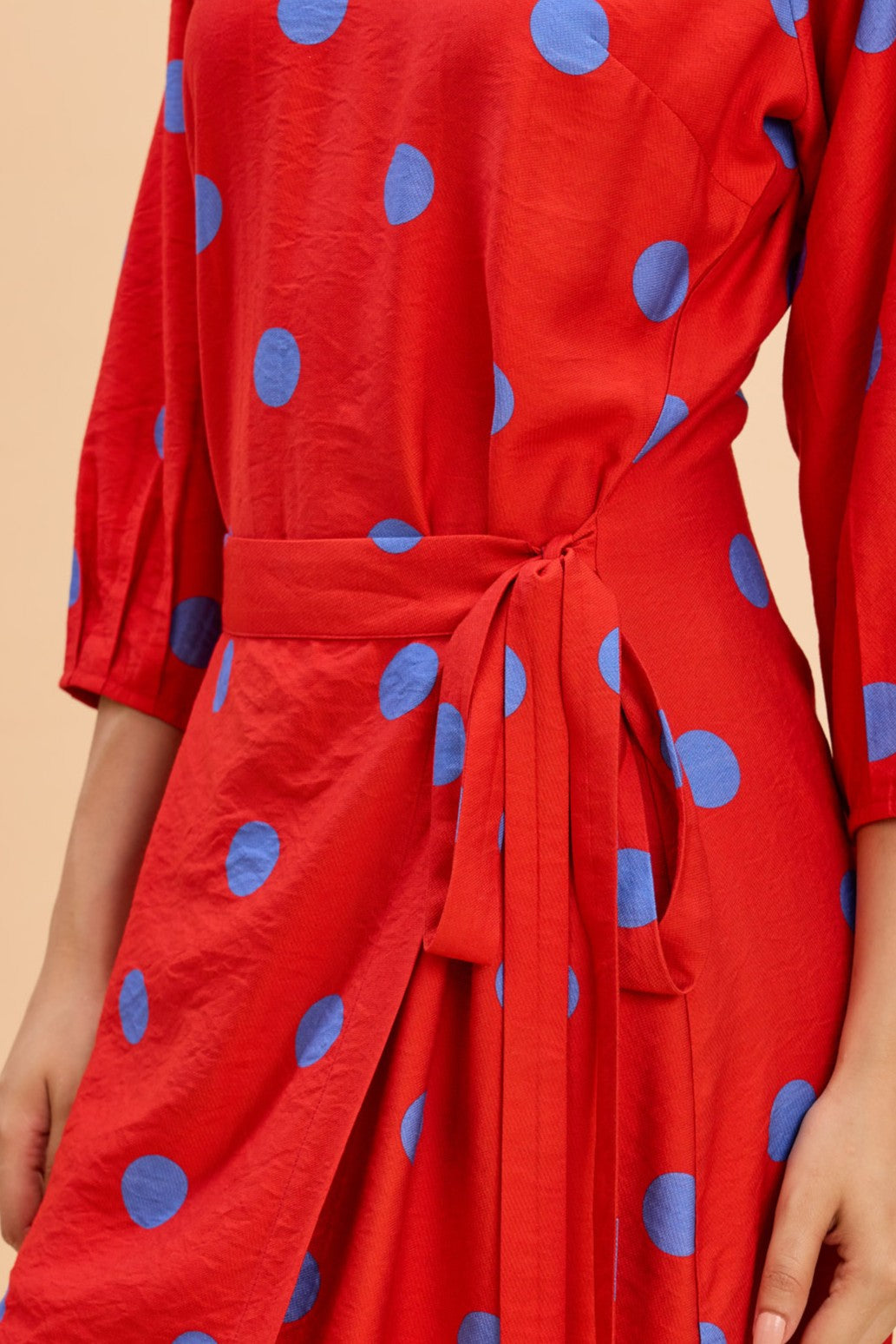 Polka Dot print in a straight relaxed fit with round neckline and three-quarter sleeves alng with matching self fabric tie-up belt at the waist