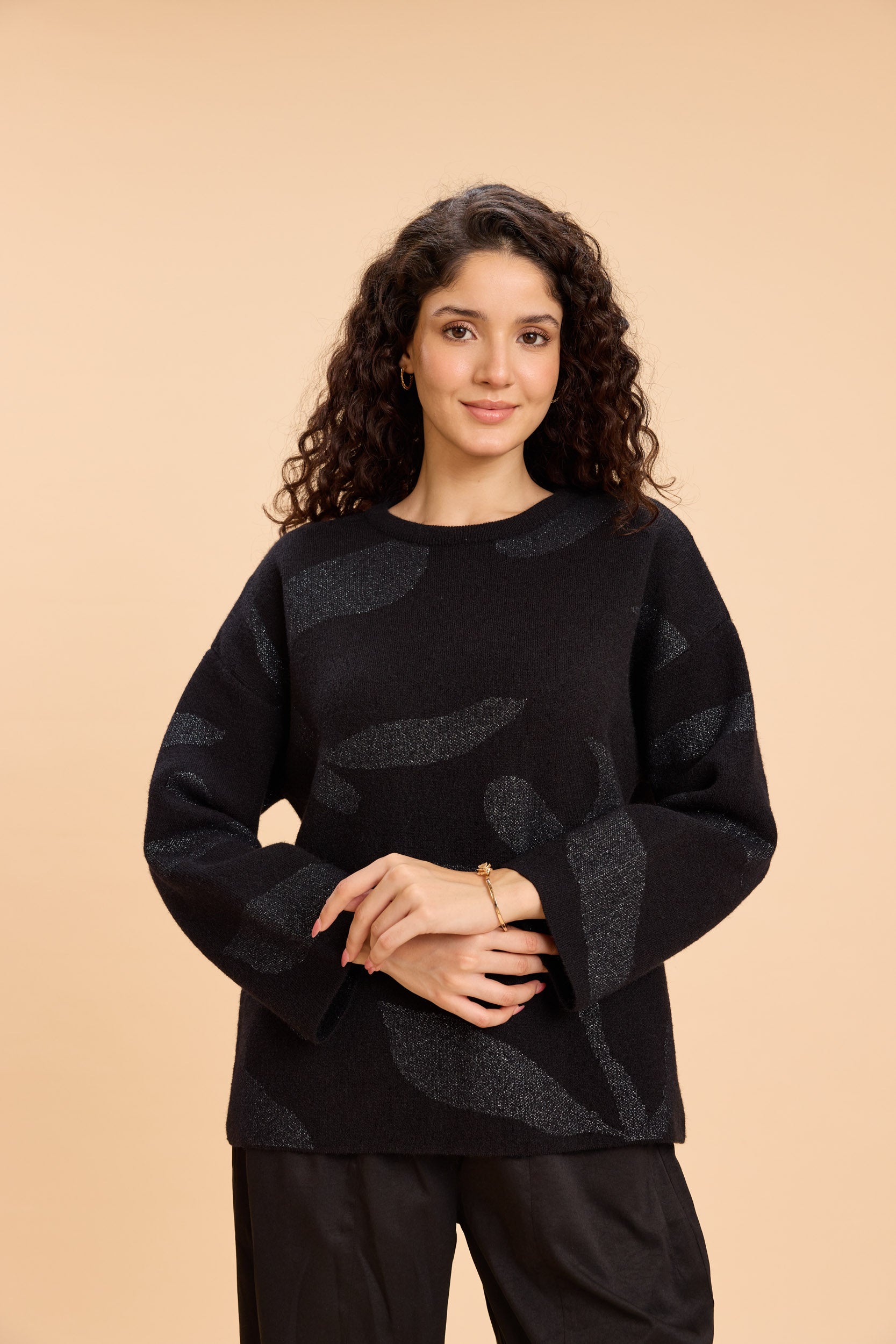 Black drop shoulder high neck sweater with in viscose with a metallic abstract jacquard floral pattern