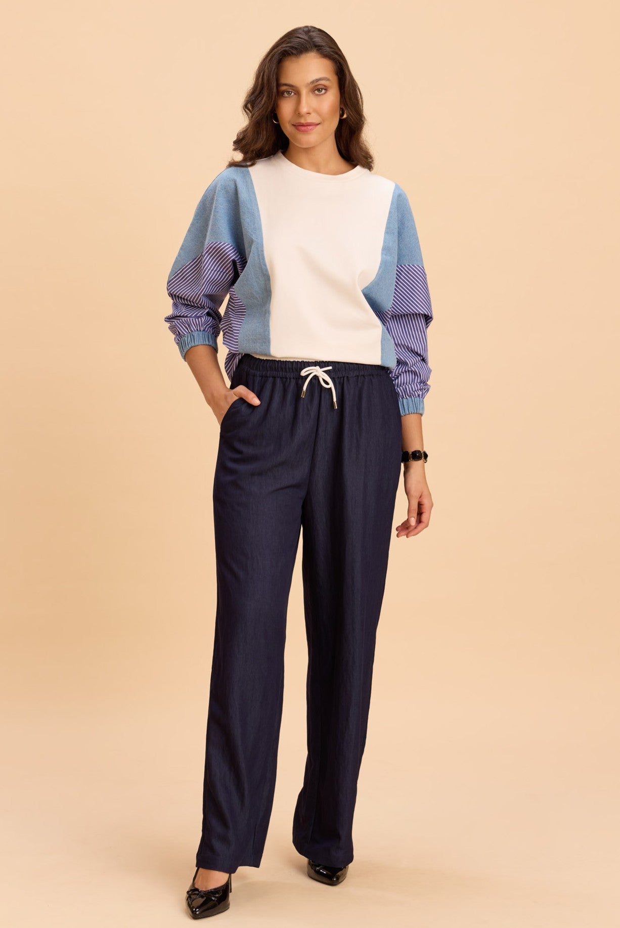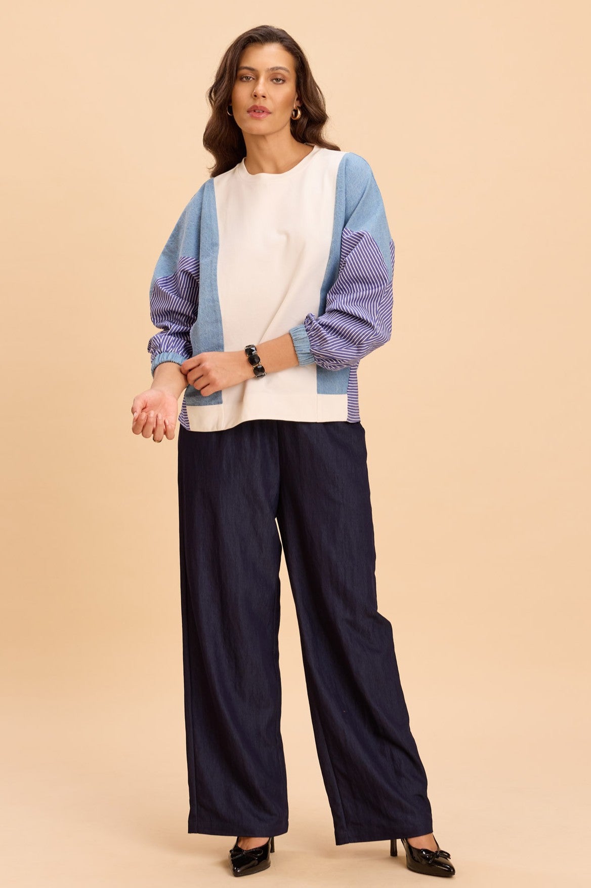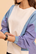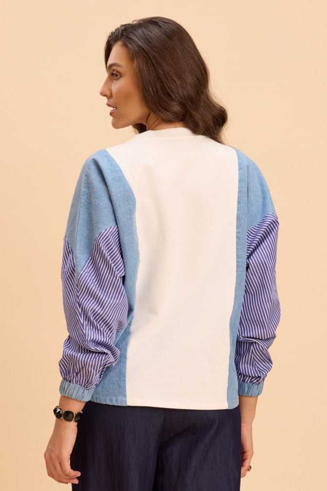 Cotton sweatshirt with color-blocked chambray panels and striped raglan sleeves with ribbed cuffs and relaxed drop-shoulder fit