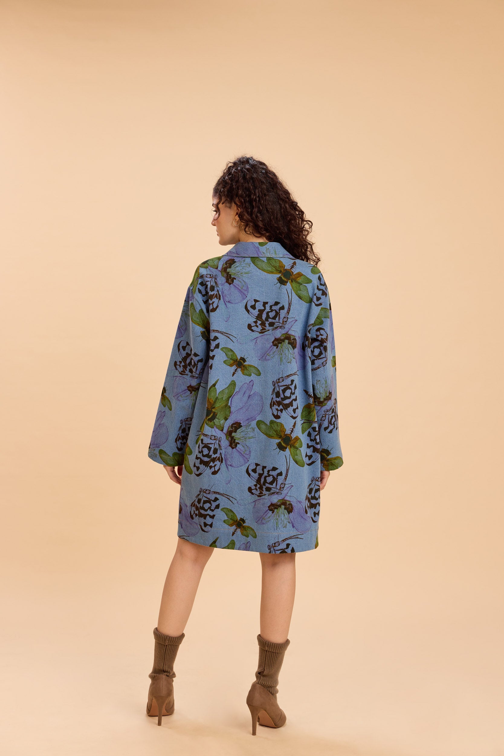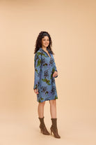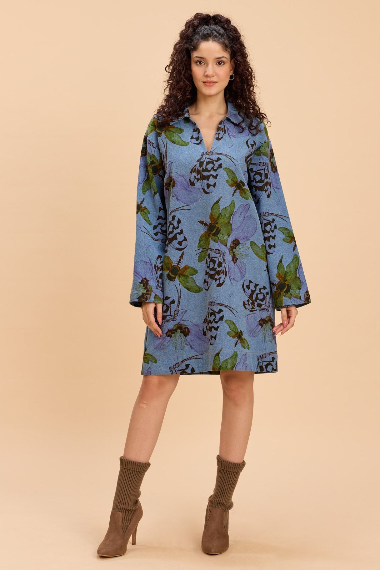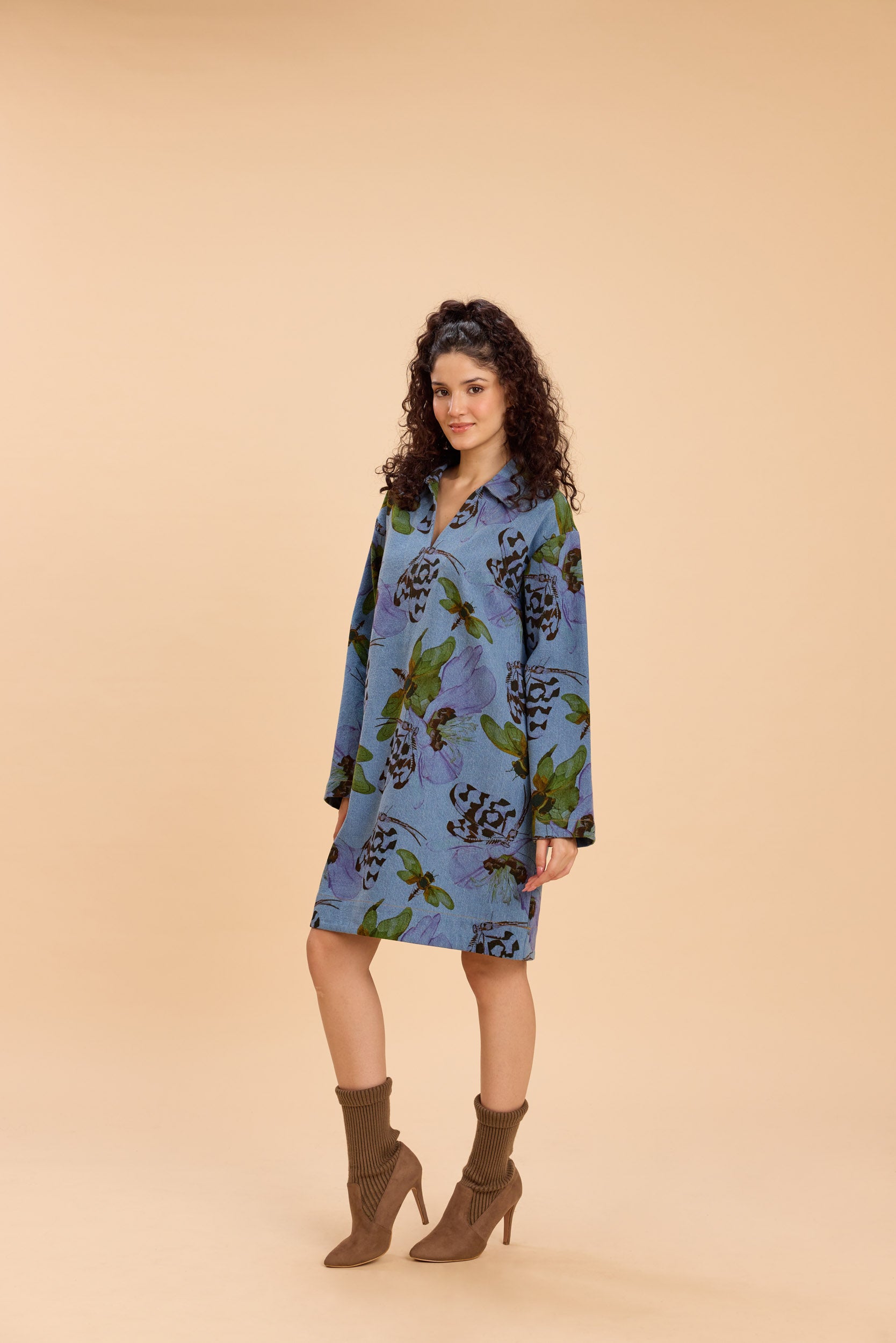 Printed cotton denim knee-length dress detailed with a regular collar and full sleeves