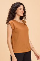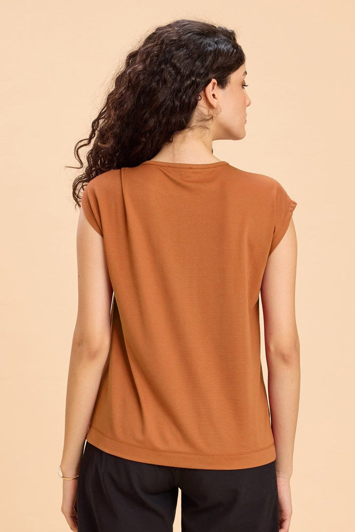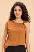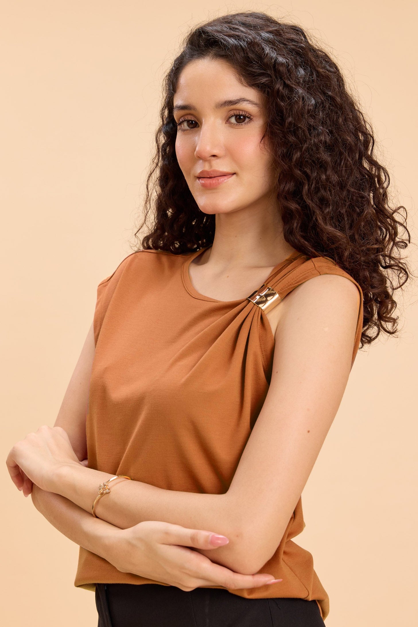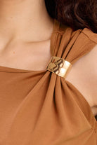 Asymmetrical Top with gathered shoulder highlighted with gold-tone hammered ring