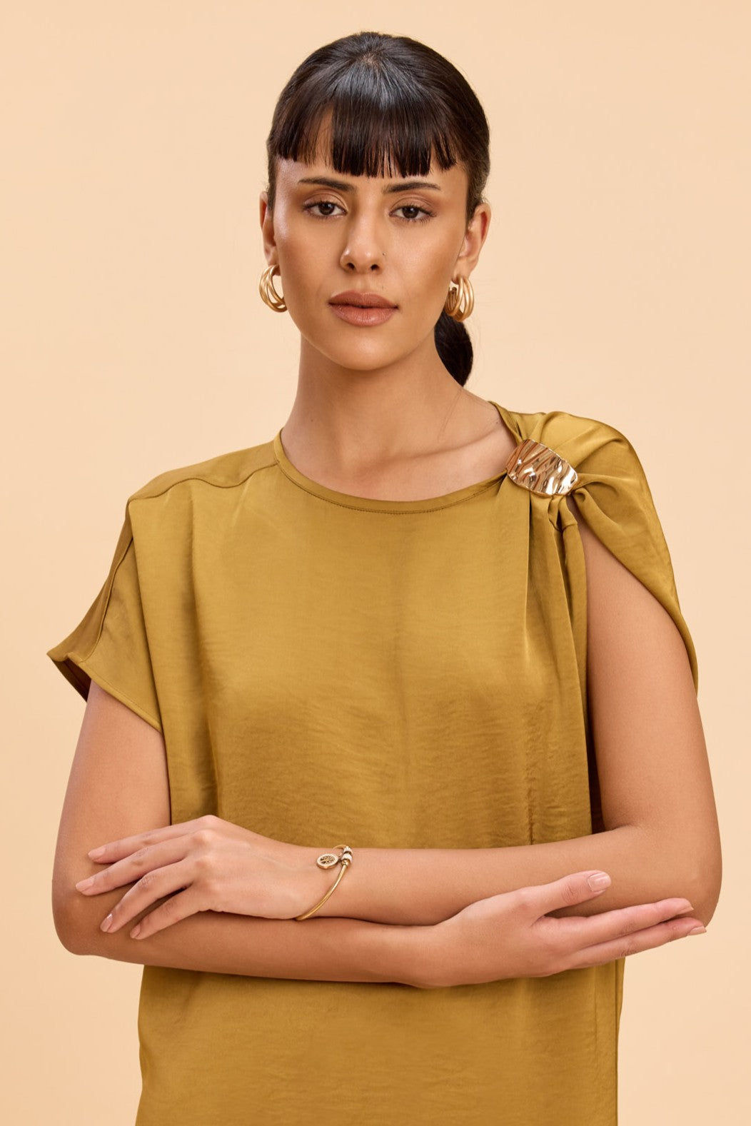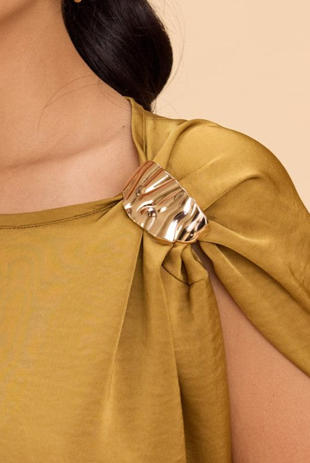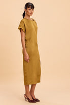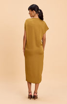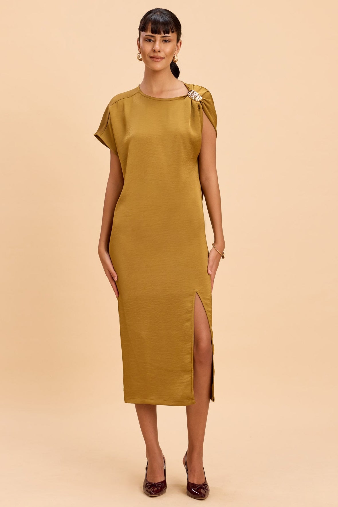 Midi-length Satin dress with front slit detailing highlighted by golden shoulder trims and asymmetric sleeves