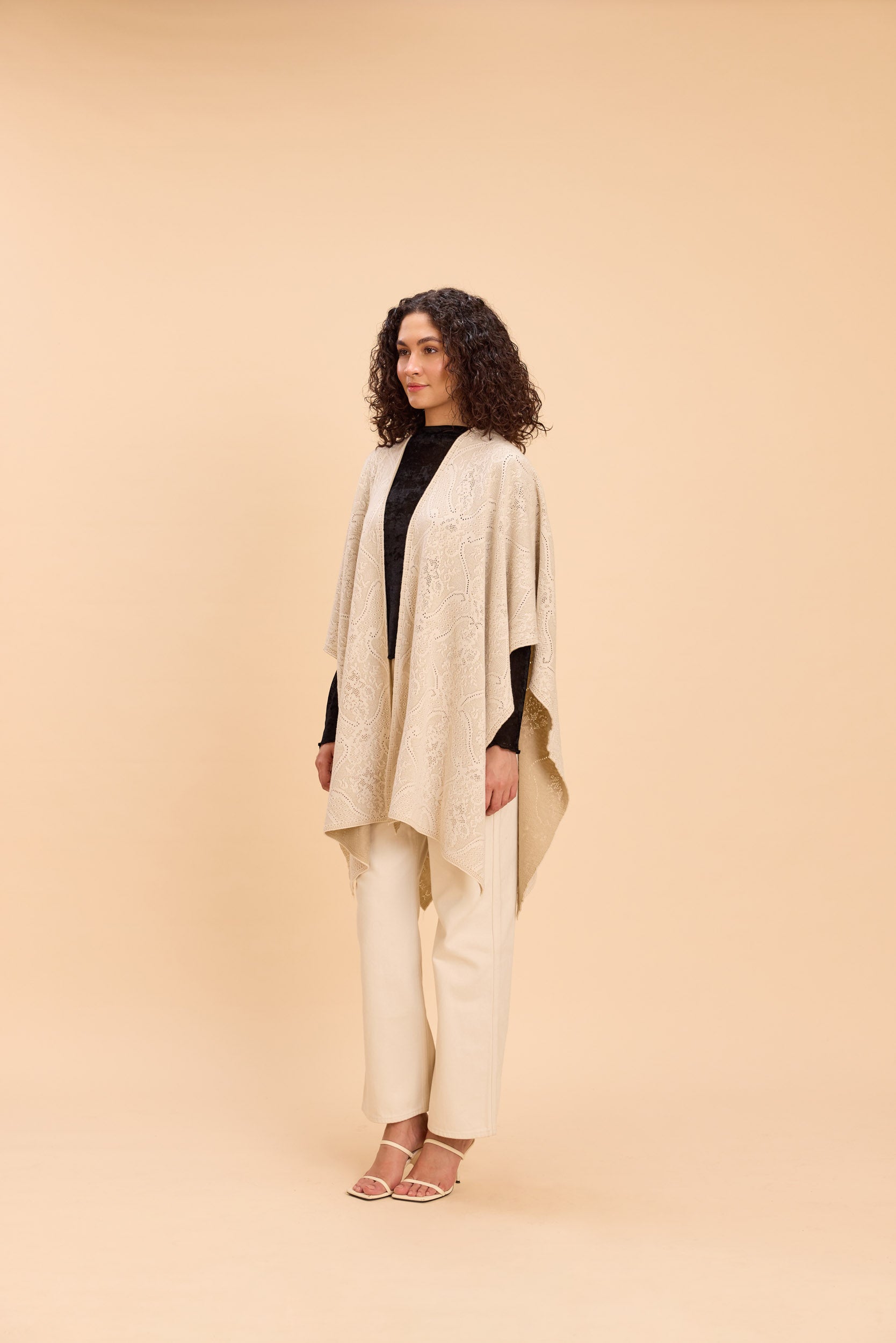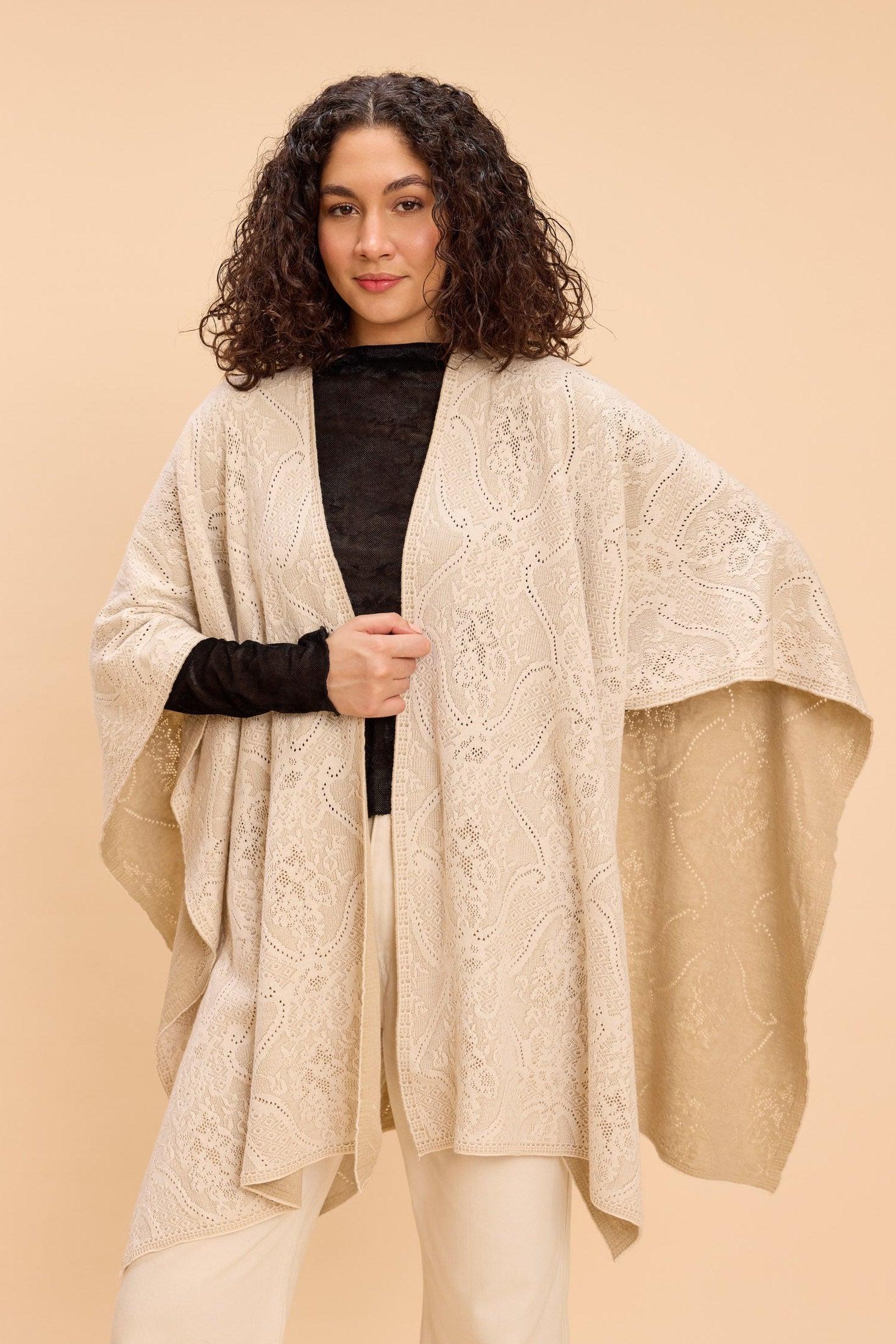 Add an easy layer of elegance with this jacquard-knitted front-open cape, detailed with a delicate lace jacquard pattern for a soft, elevated feel. Warm, cozy, and versatile enough to style multiple ways over any outfit, it’s perfect for travel days, winter brunches, festive evenings, or relaxed everyday layering.